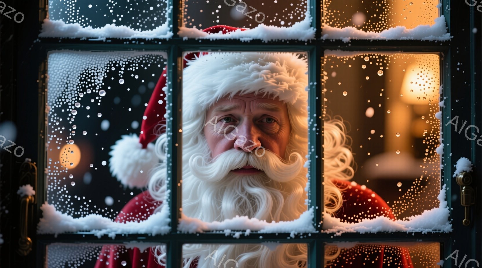 サンタクロースが赤い衣装と白いひげで描かれ、大きな袋を背負って建物の窓の外に立っている。雪が降り積もる中、窓の内側には暖炉の光が灯り、居心地の良い部屋が映し出されている。満月が輝く夜空と雪景色が、静かで幻想的な雰囲気を醸し出している。