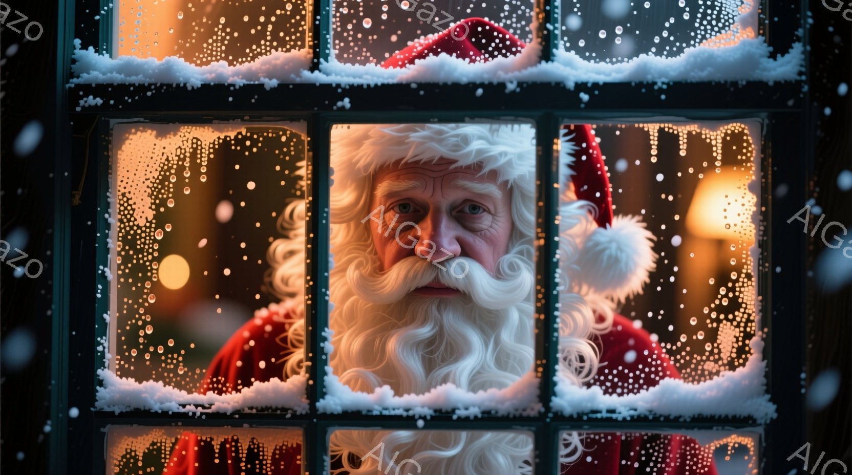 白いひげを長く伸ばしたサンタクロースが、窓から顔を出しています。赤い衣装を身につけ、優しく微笑んでおり、暖かく穏やかな雰囲気を醸し出しています。背景にはぼやけた光と、雪が降る様子が伺え、クリスマスの静かで温かい夜を思わせます。