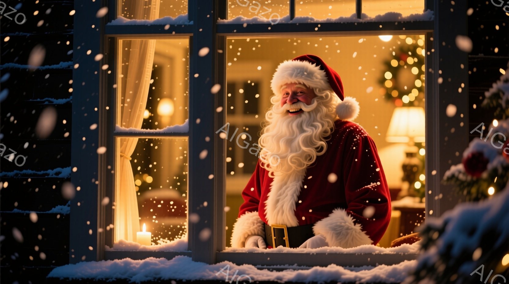 雪が降り積もった庭に、サンタクロースが立っている。彼は赤い衣装と白いひげ、そして笑顔を浮かべており、クリスマスの象徴的な姿をしている。背景にはライトアップされた家があり、温かい光が雪景色に映え、静かで幻想的な雰囲気を醸し出している。