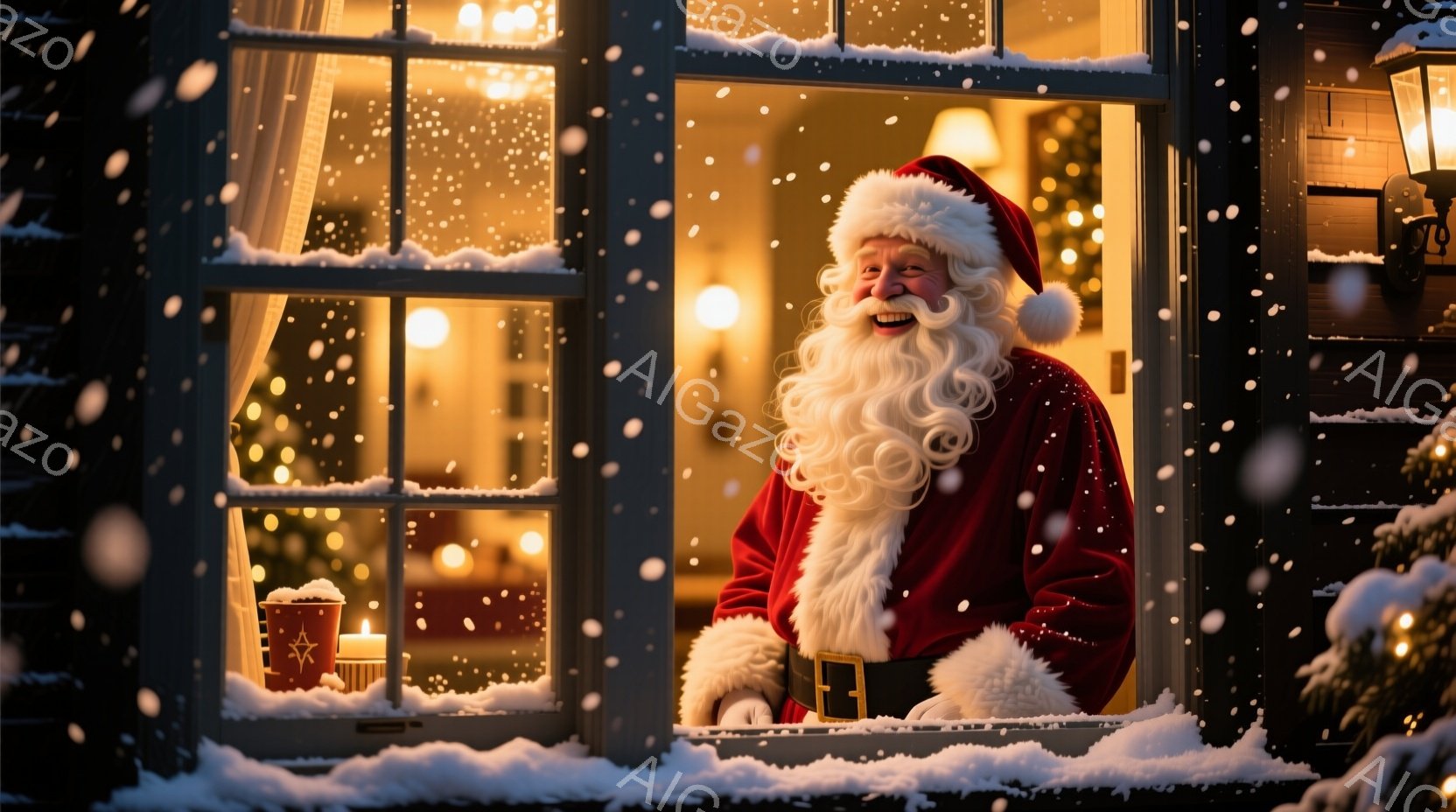 暖炉の光が差し込む窓辺に、サンタクロースが笑顔で立っている。ふさふさの白いひげと赤い衣装を身につけ、暖かく親しみやすい表情をしている。背景にはぼんやりとクリスマスツリーや室内装飾が見え、雪が舞う冬の穏やかな雰囲気が漂っている。