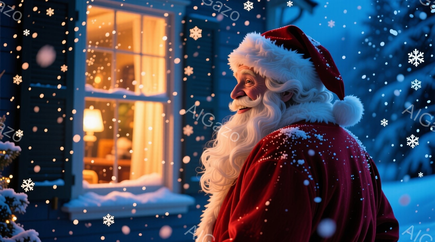 白いひげをたくわえたサンタクロースが、赤い衣装と白い毛皮の縁取りの帽子を身につけ、少し横を向いて微笑んでいます。背景には、暖色の光が灯った家の窓があり、雪が舞う冬の夜を表しています。 全体的に、温かく、お祝いムードの漂う、クリスマスの情景です。
