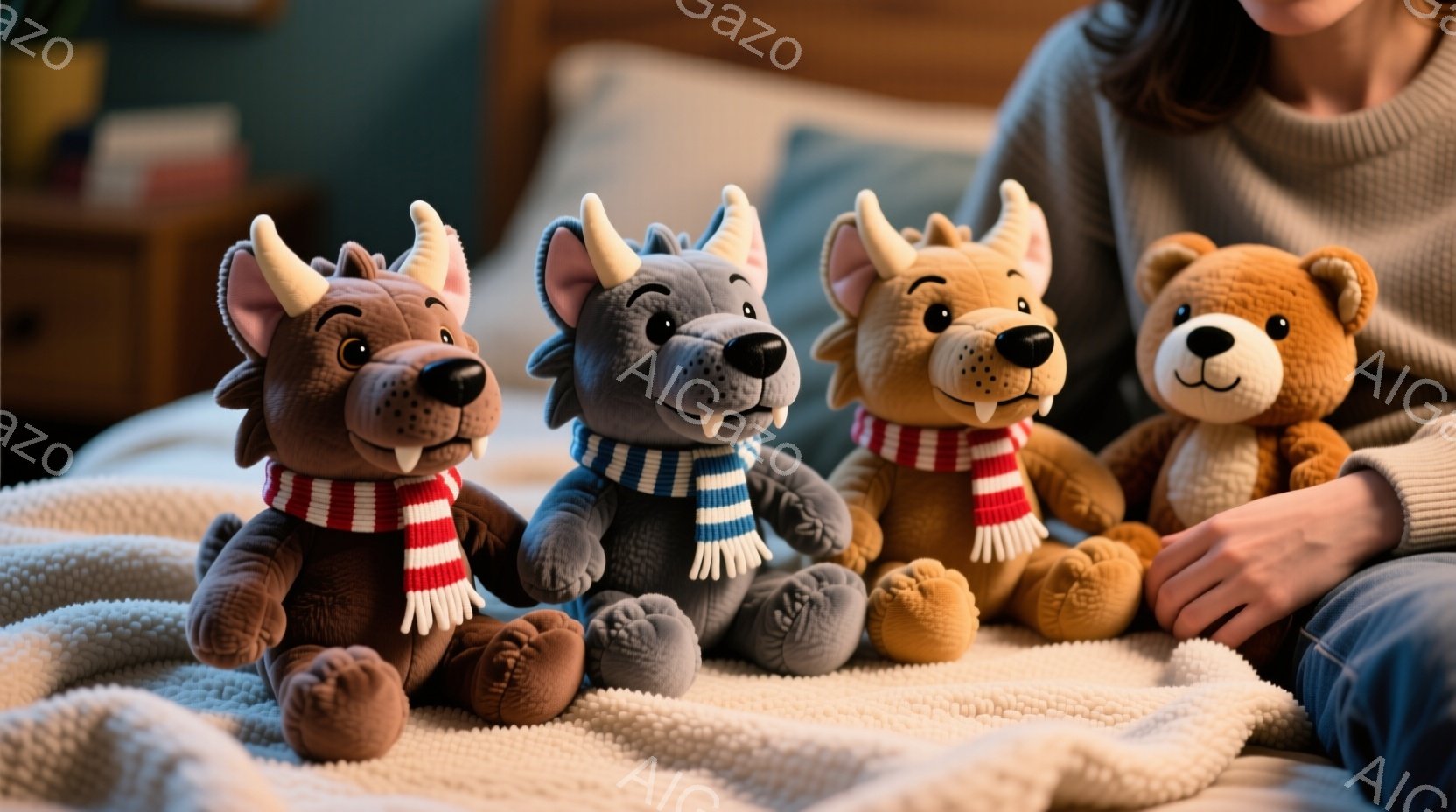 柔らかいクリーム色の毛布の上に、3匹の黒いぬいぐるみと1匹の茶色のクマのぬいぐるみが座っています。黒いぬいぐるみはそれぞれオレンジ色と赤色のスカーフを巻いており、愛らしい表情をしています。背景にはぼやけた家具が見え、全体的に暖かく心地よい雰囲気が漂っています。