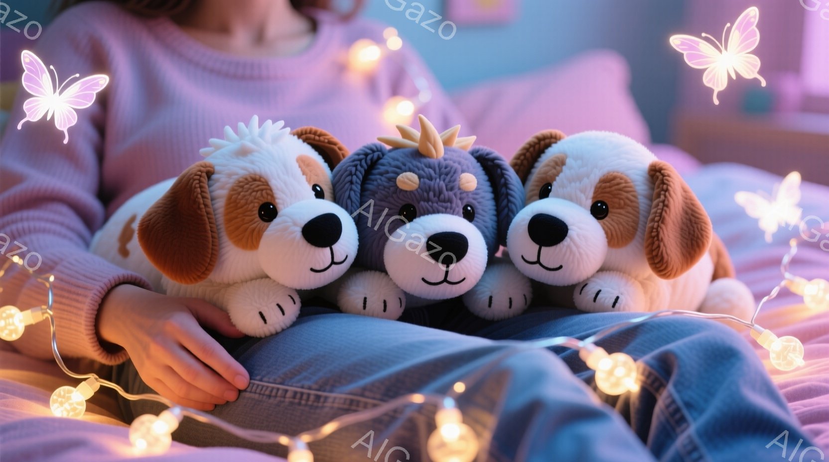 膝の上に三匹のぬいぐるみ犬が並んで座っています。犬たちはそれぞれ茶色、白とグレー、黒と白の毛並みで、愛らしい表情をしています。背景にはぼんやりとした光のカーテンがあり、暖かく穏やかな雰囲気が漂っています。