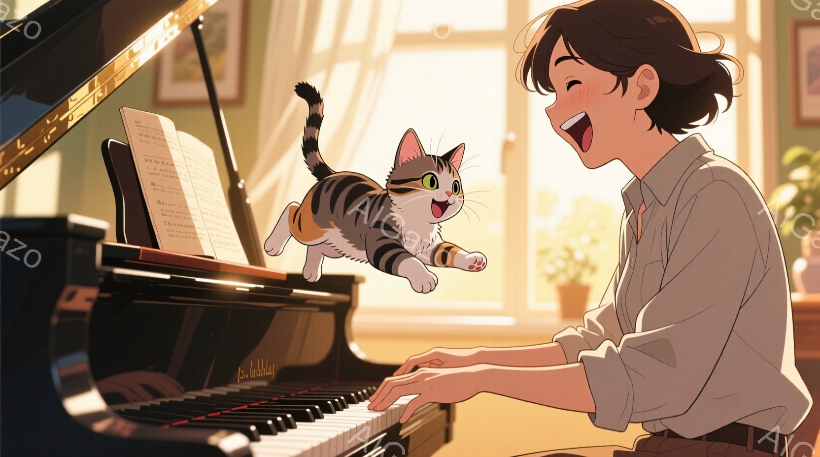 明るい黄緑色の背景を背に、大きな茶色の縞模様の猫のぬいぐるみと若い男性が写っています。男性は明るい黄色のシャツを着ており、驚いた表情で両手を高く上げて拍手しています。猫のぬいぐるみはピアノの鍵盤に前足を置き、まるで演奏しているかのようなポーズを取っています。