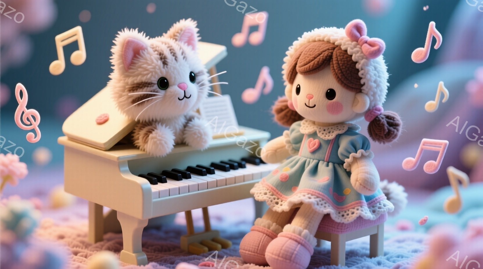 白い縞模様の猫がピンクのリボンをつけて、小さなピアノの隣に座っています。茶色の巻き毛の女の子の人形は、レースの付いた青とピンクのドレスを着て、ピアノの前に座って演奏しているようです。背景はパステルカラーで、音楽記号が浮かんでおり、温かく夢幻的な雰囲気です。