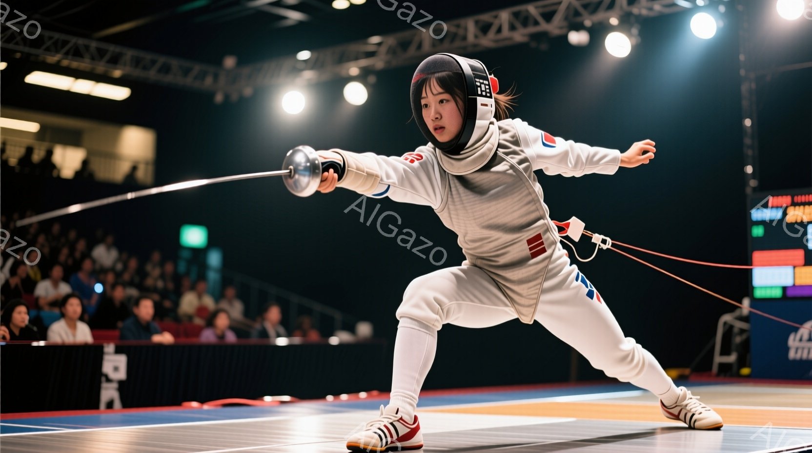 フェンシングの選手が競技中に写っている写真です。彼女は白いフェンシングスーツを着用し、ヘッドギアをかぶって、集中した表情で剣を構えています。背景には青いフェンスと、ぼやけた観客席が見え、競技場の熱気と緊張感が伝わってきます。