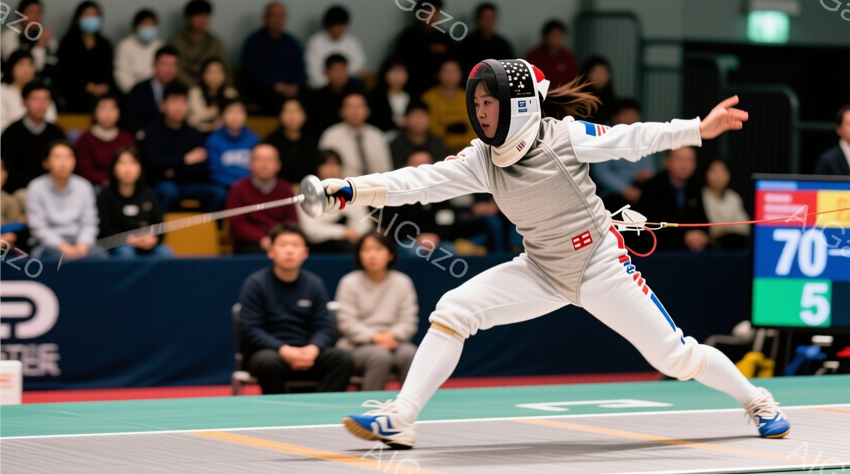 この無料AI生成画像「フェンシングの競技者が試合中に動き出している様子が写っている。競技者は白いフェンシングスーツとヘルメットを着用し、髪をポニーテールにしている。背景には観客席が見え、床は緑色のフェンシングコートで、競技は屋内で行われていることがわかる。」は、2025年10月22日に作成されました。 サイズは 1664×928px の高解像度で、商用利用も可能なフリー素材として提供しています。