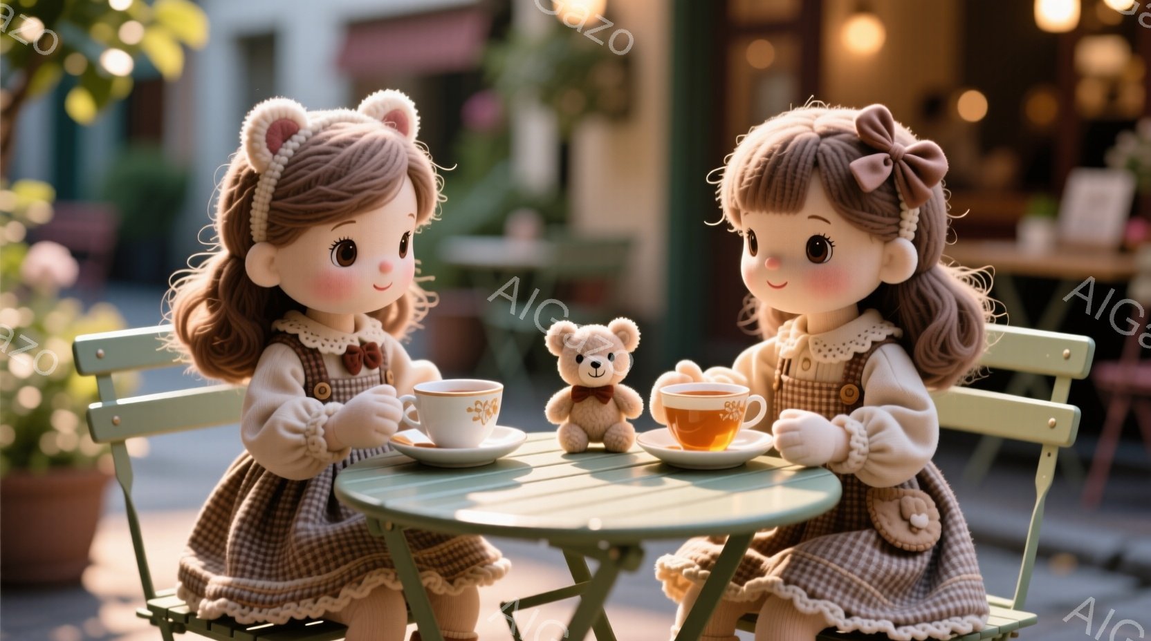 明るい茶色の巻き毛に、白いリボンをつけた女の子が、緑色のテーブルを挟んで向かい合って座っています。茶色の水玉模様のワンピースを着ており、それぞれ手にティーカップを持って優雅にティータイムを楽しんでいます。背景にはぼやけた建物と木々が見え、暖かく穏やかな雰囲気です。