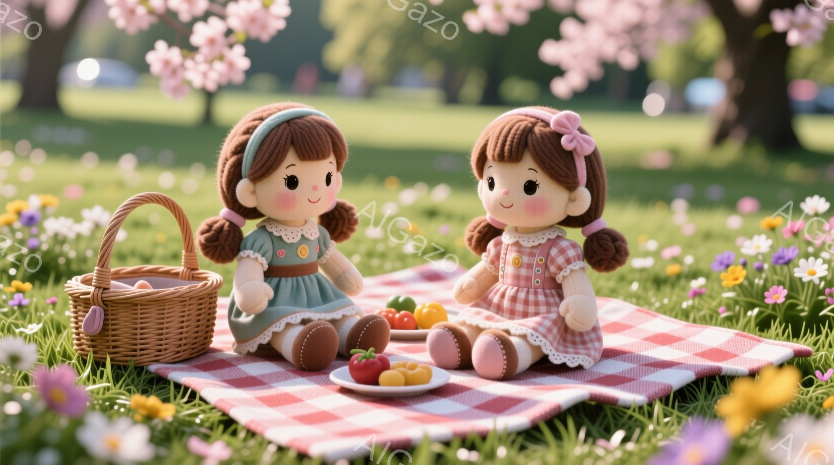 赤毛で巻き毛の髪型をした二人の人形が、ピクニックマットの上で向かい合って座っています。それぞれ青とピンクのチェック柄のワンピースを着ており、表情は穏やかで微笑んでいます。背景には桜の花びらが舞い、緑豊かな草地とぼやけた木々が広がり、春の穏やかなピクニックの雰囲気を醸し出しています。