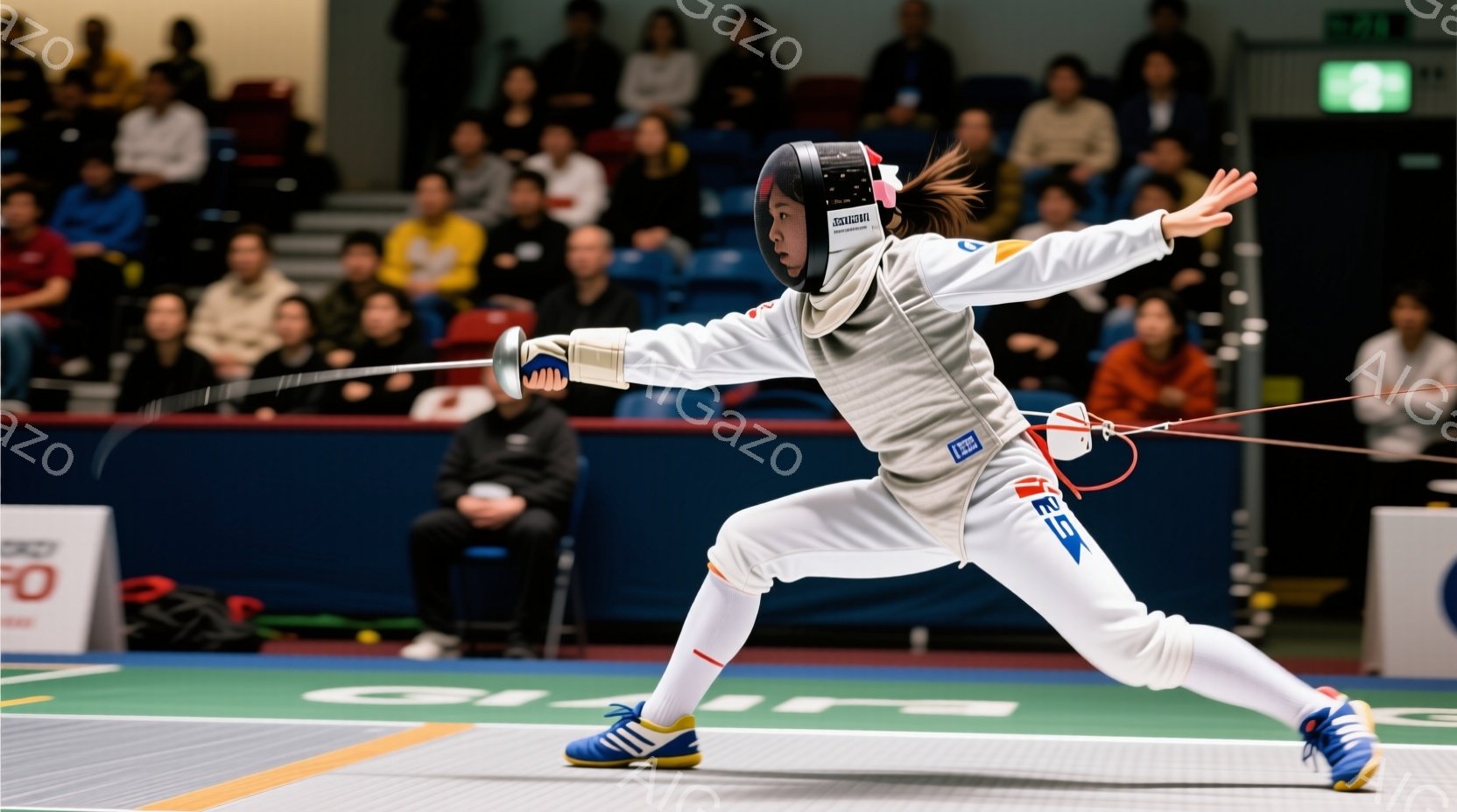 フェンシングの競技者が試合中にアタックしている様子が写っている。白とネイビーのフェンシングスーツに、プロテクターとマスクを着用し、髪はポニーテールにまとめられている。背景には観客席が見え、競技場の床は青色で、全体的に集中した競技の雰囲気が漂っている。