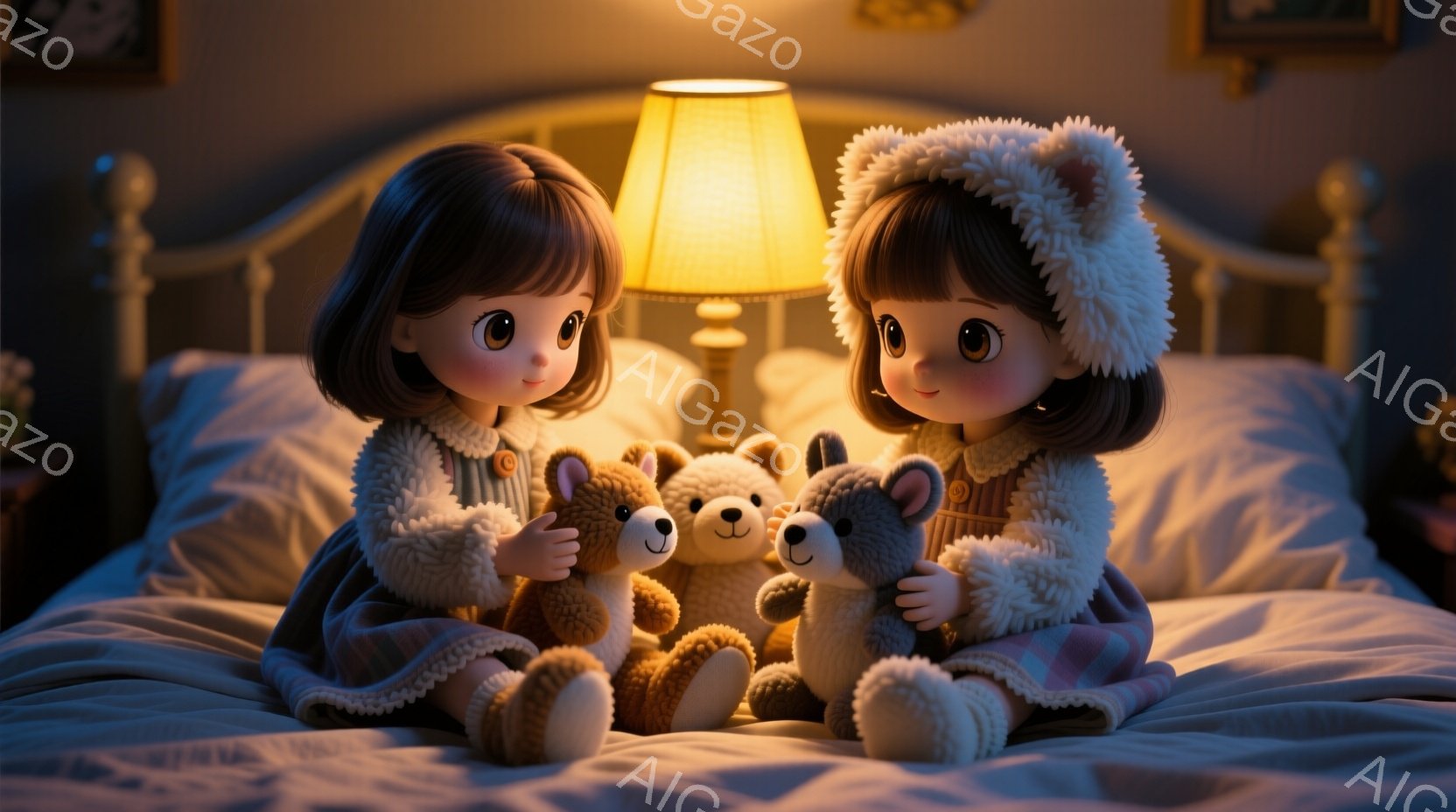 可愛らしい女の子の双子がベッドに並んで座っており、それぞれテディベアを抱きしめています。彼女たちはピンクがかった灰色のドレスを着ており、頭にはクマの耳がついた帽子を被っています。背景には、夜の雰囲気を示す柔らかな光を放つテーブルランプとサイドテーブル、そしてぼんやりとした部屋の内装が見えます。