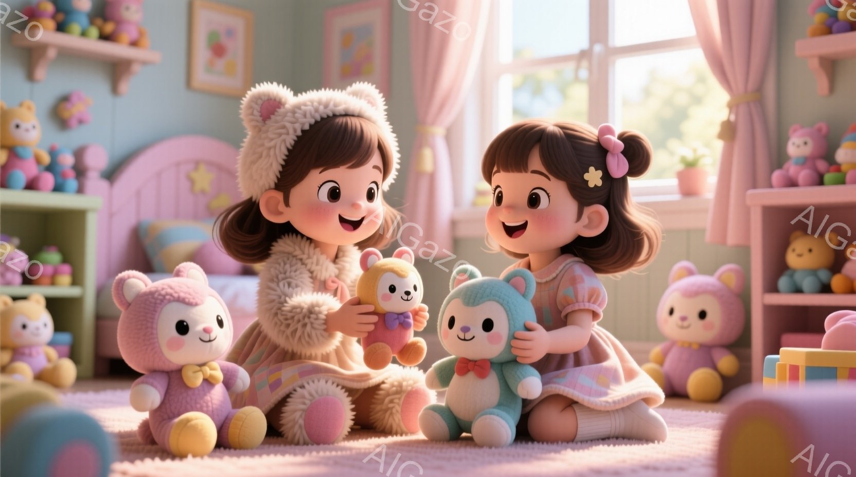 幼い双子の女の子が、ふわふわの毛布に包まれ、それぞれ黄色と水色のテディベアを抱きかかえて座っています。彼女たちは同じ髪型で、前髪を整え、笑顔を見せており、無邪気で幸せな様子が伺えます。背景には、カラフルなぬいぐるみや窓からの柔らかい光が広がり、温かく優しい雰囲気を醸し出しています。