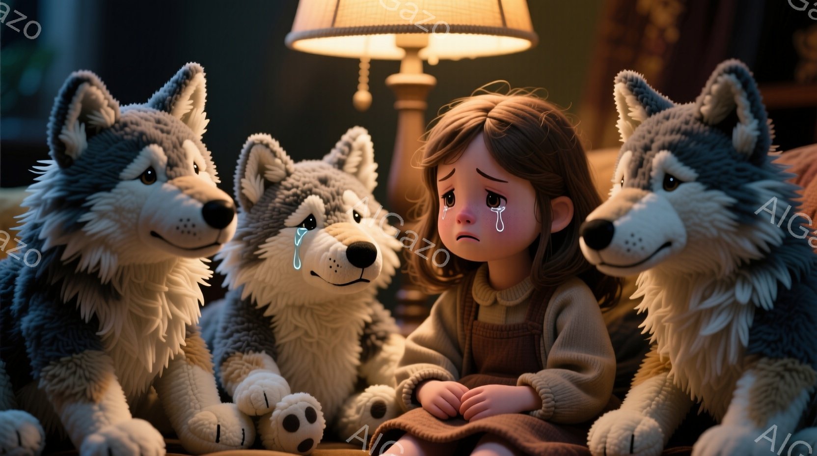 茶色の巻き毛の少女が、大きな灰色の狼のぬいぐるみ4匹に囲まれて座っています。彼女は薄いピンク色のワンピースを着ており、目に涙を浮かべています。背景には、ぼやけた家具が見え、全体的に少し不気味で不安な雰囲気です。