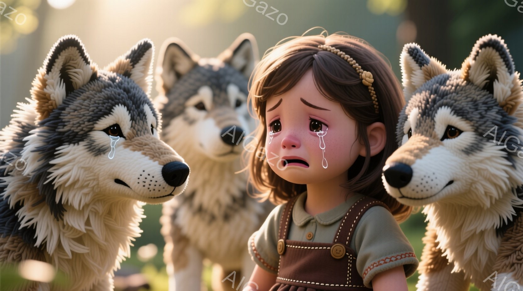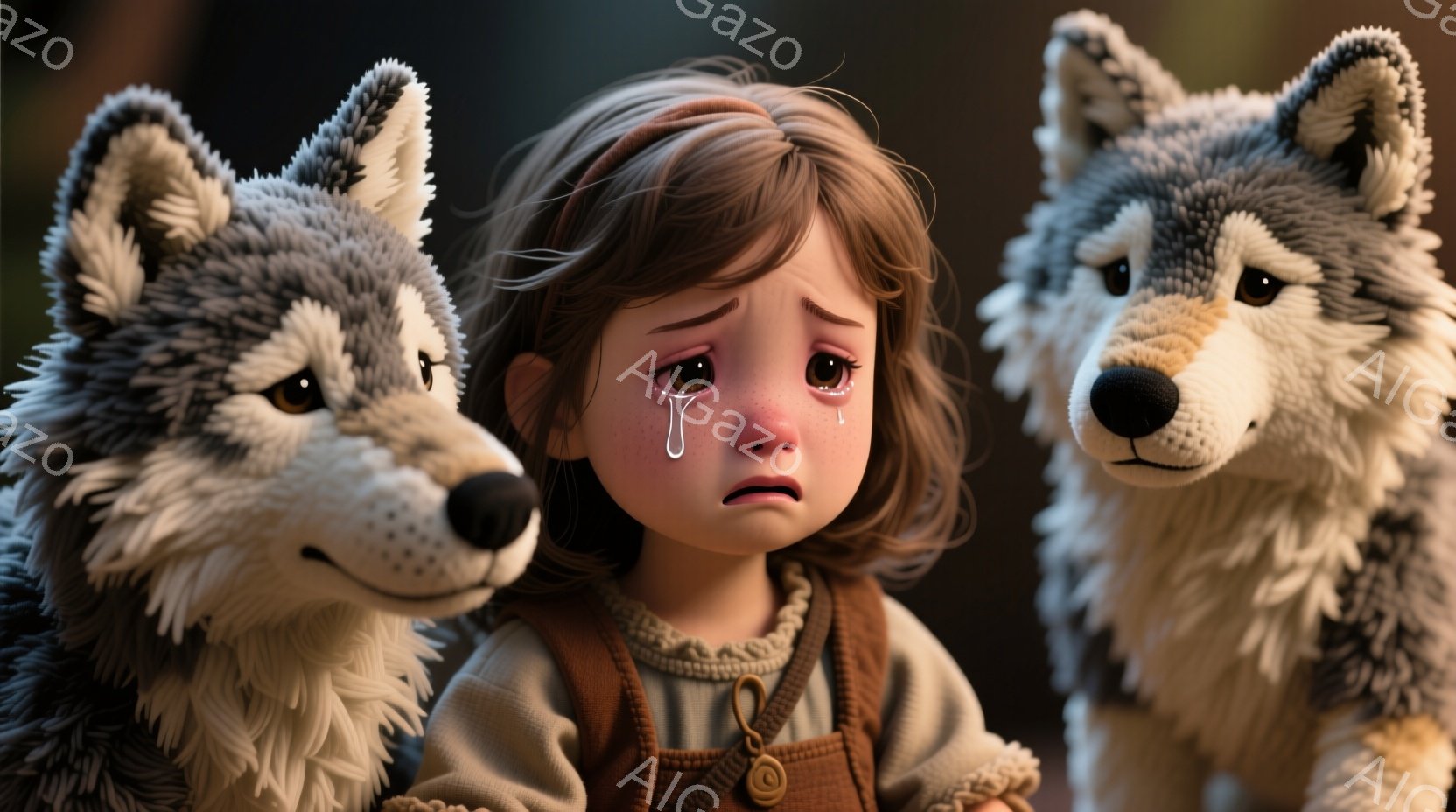 茶髪の少女が泣いており、頬には涙が浮かんでいる。ベージュ色のオーバーオールを着ており、周囲には4匹の灰色と白のオオカミに囲まれている。背景は暗く、ぼやけており、全体的に悲しみと不安な雰囲気が漂っている。