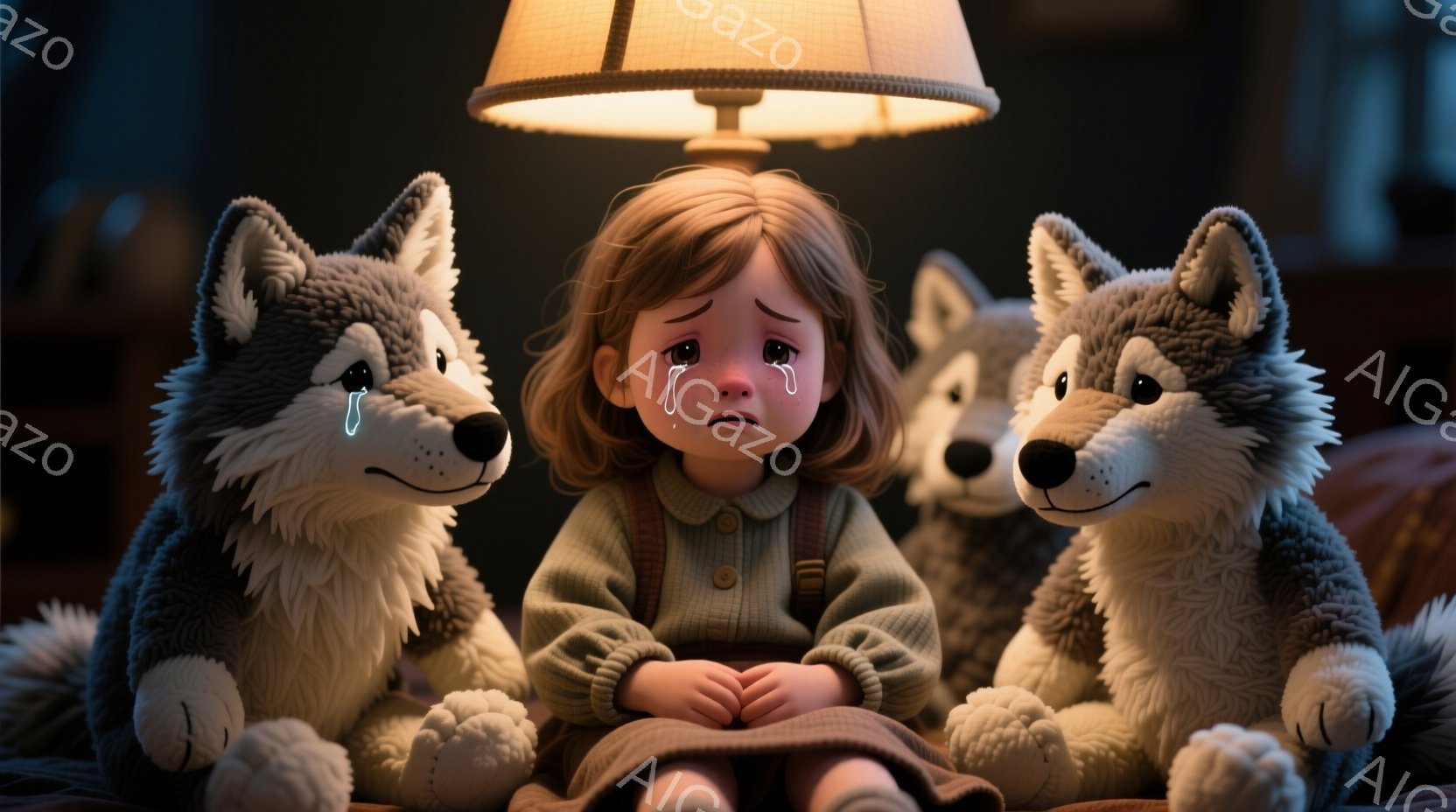 小さな女の子が悲しそうな表情で座っており、彼女の周りには3匹の毛皮のようなオオカミがいます。女の子は茶色の短い髪で、灰色のドレスを着て、両手で膝を抱えています。背景は暗く、暖色系のテーブルランプが彼女たちを照らし、全体的に寂しげで切ない雰囲気を醸し出しています。