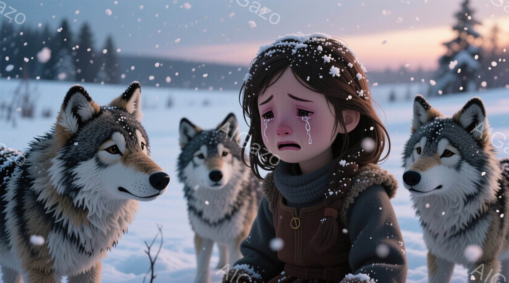 雪景色の中で、少女が悲しげな表情で膝を抱えて座っている。彼女は茶色の髪を二つに結び、薄いピンク色のセーターとスカートを着ている。周りには3匹のオオカミが彼女を取り囲むように座っており、雪が静かに降り積もる冬の風景が広がる。