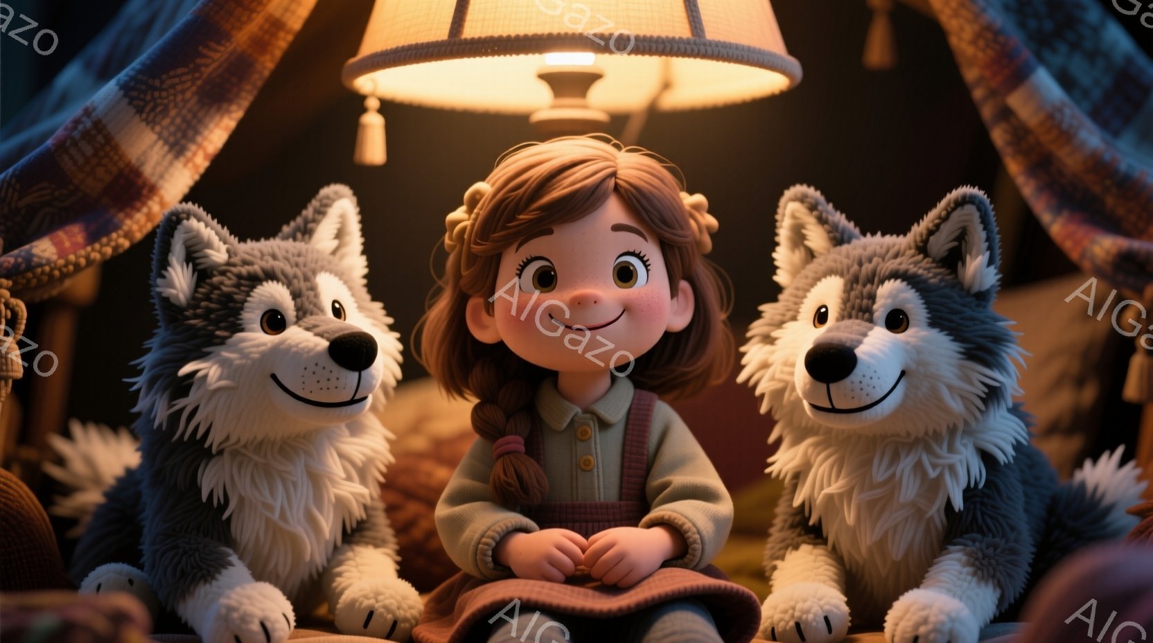 茶色の巻き毛の少女が、2匹のハスキー犬に挟まれて座っています。少女はセーターとオーバーオールを着ており、笑顔で幸せそうに見えます。背景には、暖色のランプとバスケットがあり、全体的に温かく穏やかな雰囲気です。