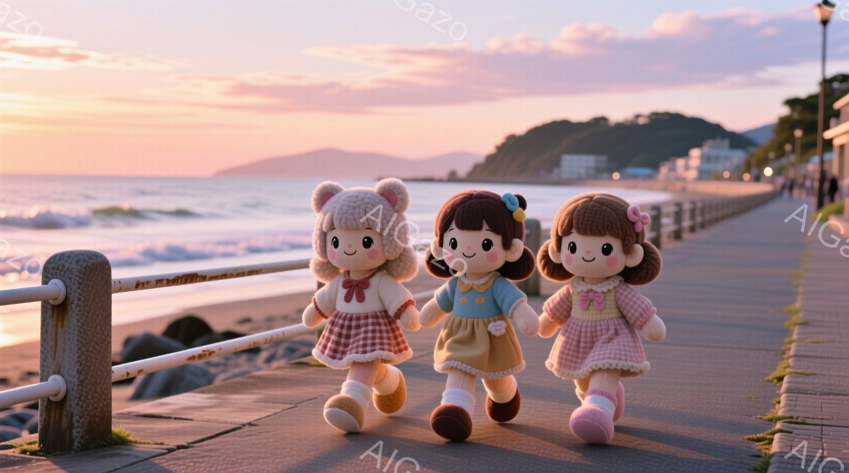 海辺の遊歩道を歩く3体の可愛らしい人形が写っています。それぞれピンク、赤、水色の帽子とドレスを身に着け、白い靴を履いています。背景には、夕焼け空と海、そして遠くの建物が見え、穏やかで温かい雰囲気を醸し出しています。
