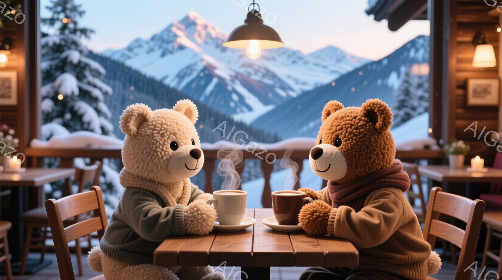 ふわふわの茶色のクマと白いクマが、暖かいセーターを着てテーブルを挟んで向かい合って座り、それぞれカップに入った温かい飲み物を楽しんでいます。背景には雪山が広がり、木造のカフェのような場所で、キャンドルやクッションなどが配置され、温かく穏やかな雰囲気が漂っています。雪景色と室内照明が組み合わさり、冬の静寂と安らぎを感じさせる光景です。