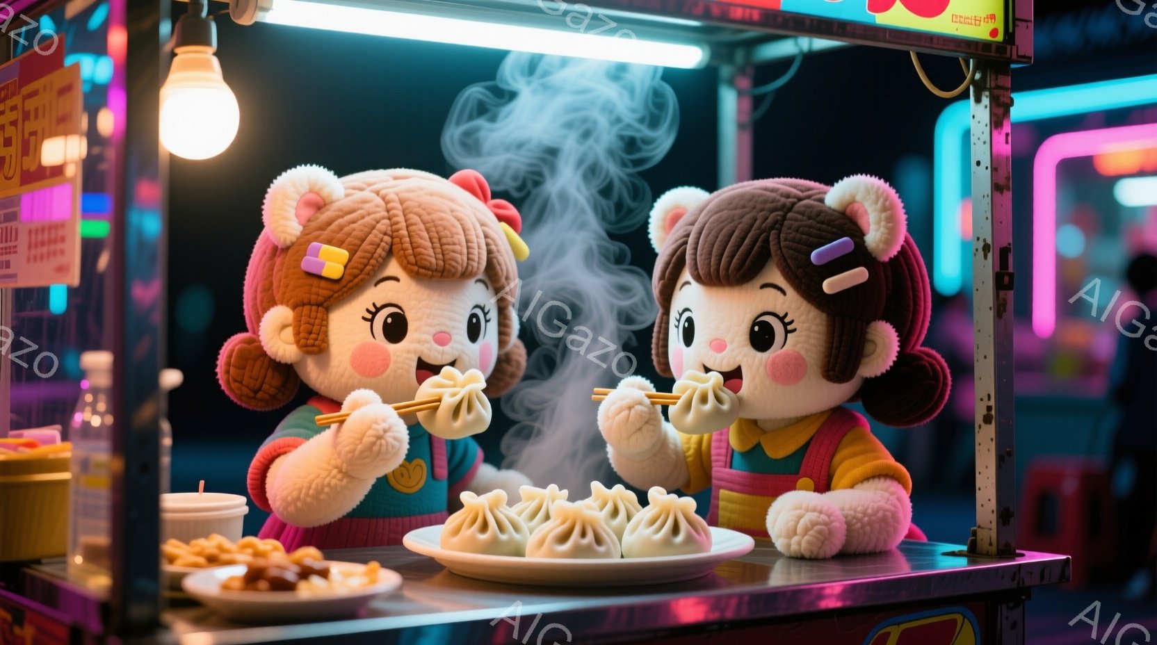 可愛らしい人形が二人、夕焼けのビーチを並んで歩いています。一人は黄色のワンピースに水色のリボン、もう一人はピンクのワンピースに黄色のリボンをつけ、どちらも黒髪で同じ笑顔を浮かべています。背景にはヤシの木が生い茂り、穏やかな波が打ち寄せ、夕焼け空がロマンチックな雰囲気を醸し出しています。