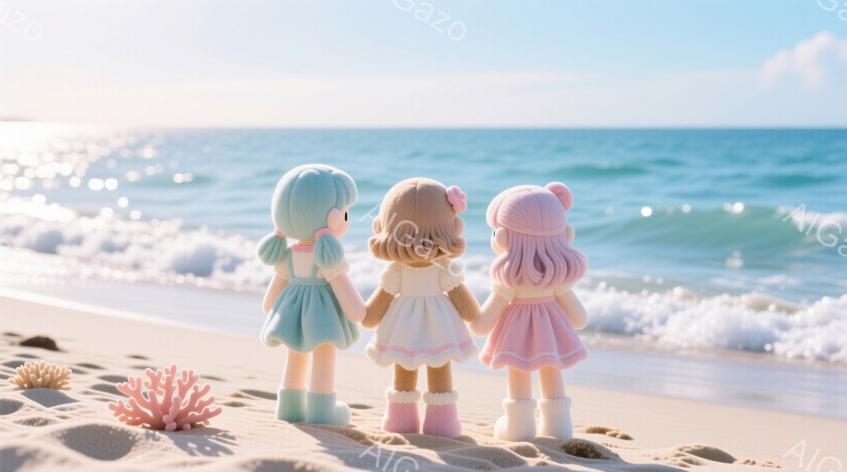 この無料AI生成画像「ターコイズブルー、薄いピンク、そしてクリーム色の3体のぬいぐるみたちが砂浜に並んで立っている。それぞれフリルが付いた可愛らしいドレスと、頭に同じくフリルが付いた帽子を身につけており、後ろ姿だけが見えている。背景には穏やかな青い海と、砂浜を彩るピンク色の珊瑚が点在し、全体的に穏やかで夢幻的な雰囲気を醸し出している。」は、2025年10月29日に作成されました。 サイズは 1664×928px の高解像度で、商用利用も可能なフリー素材として提供しています。
