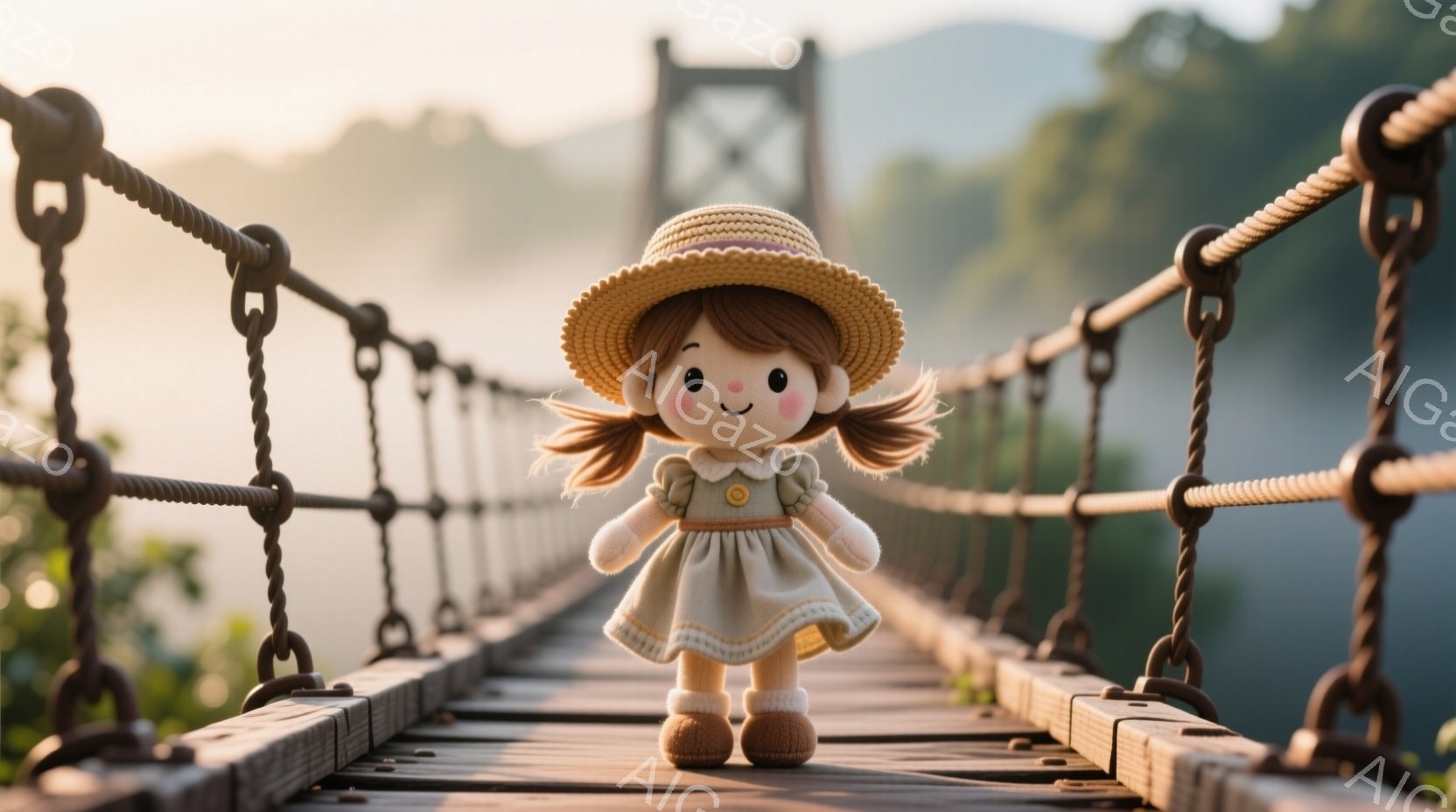 可愛らしい人形が、木製の吊り橋の中央に立っています。茶色の髪は二つに結ばれており、麦わら帽子を被っています。薄緑色のワンピースを着ており、表情は穏やかで微笑んでいます。