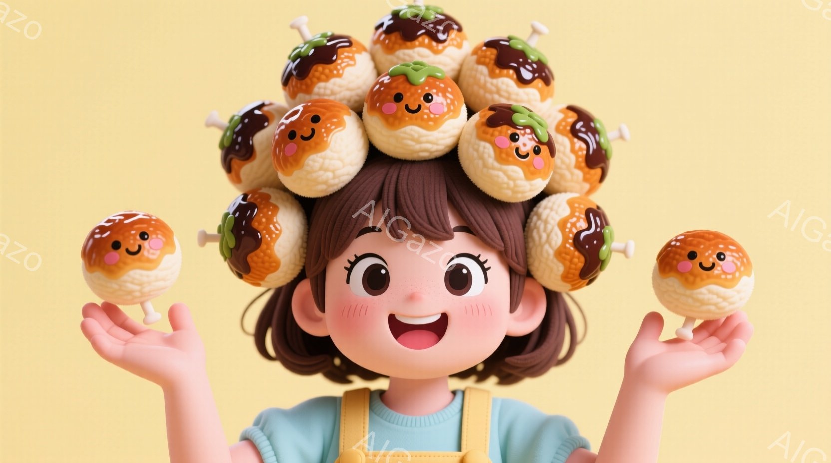 この無料AI生成画像「明るい黄色の背景に、茶色の巻き毛にたくさんの団子が乗った女の子が描かれています。彼女は笑顔で両手を広げ、黄色のセーターとオーバーオールを着ています。全体的に、可愛らしく、陽気な雰囲気が漂っています。」は、2025年10月29日に作成されました。 サイズは 1664×928px の高解像度で、商用利用も可能なフリー素材として提供しています。