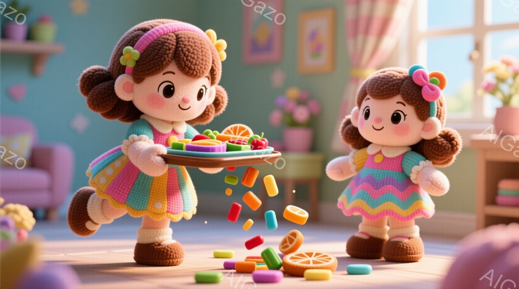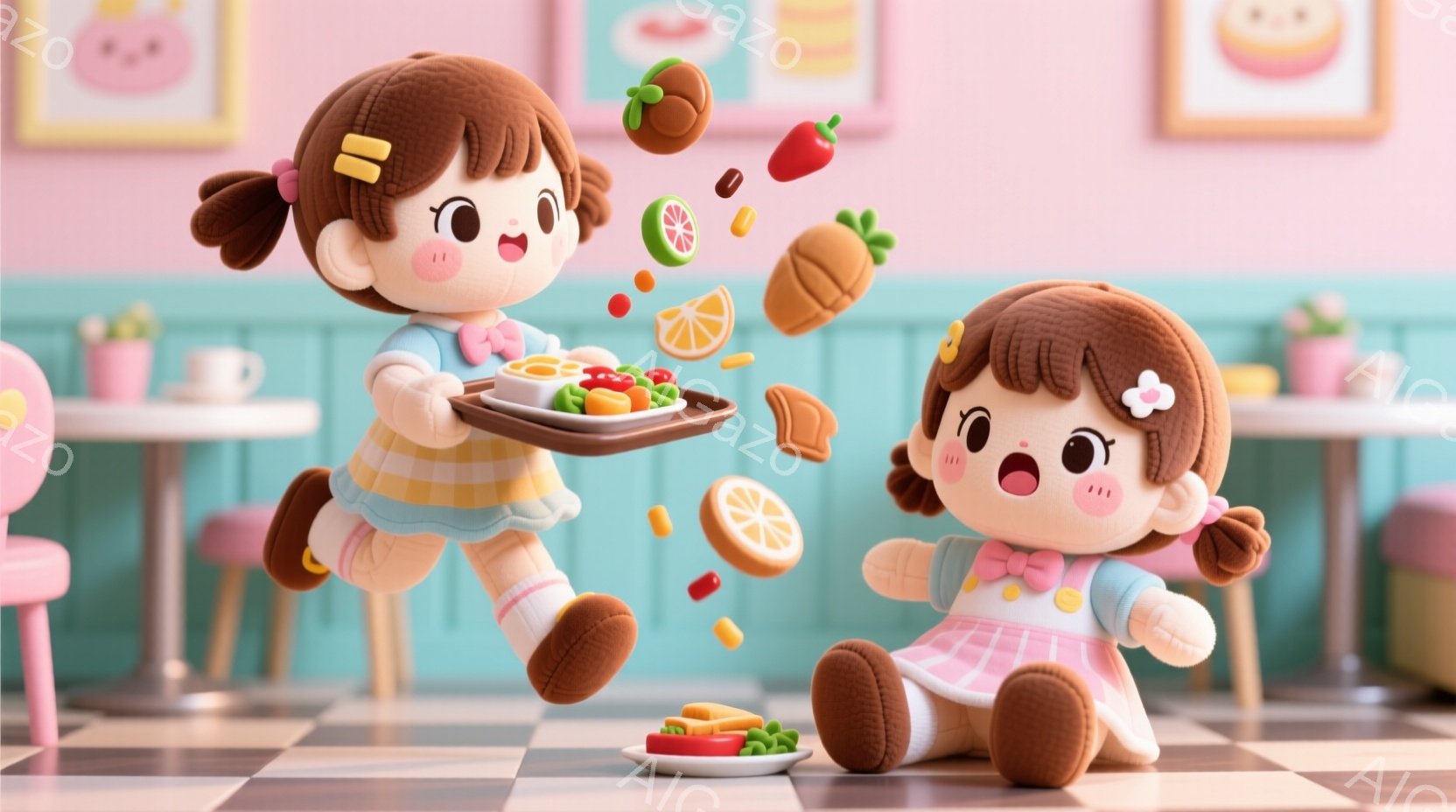 ふわふわした毛並みの女の子の人形が二人、明るいピンクとターコイズブルーを基調とした、レトロな雰囲気のカフェにいる。片方の人形はピンクのフリルスカートと水色のトップスを着て、空中で食事のトレーを運んでいる。もう片方の人形は同じ服装で、床に座って笑顔を見せている。