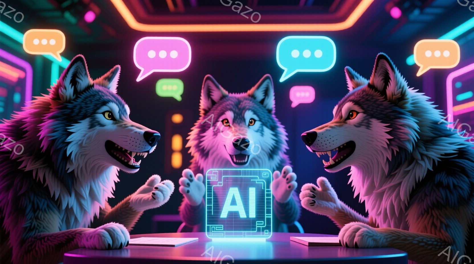 三匹の狼がテーブルを囲み、光る画面を指差している。狼たちは濃いグレーの毛並みで、少し笑ったような表情をしており、未来的な青い光に照らされた室内で、活気に満ちた雰囲気を作り出している。背景には、鮮やかなネオンライトが走るサイバーパンク風の装飾が施されている。