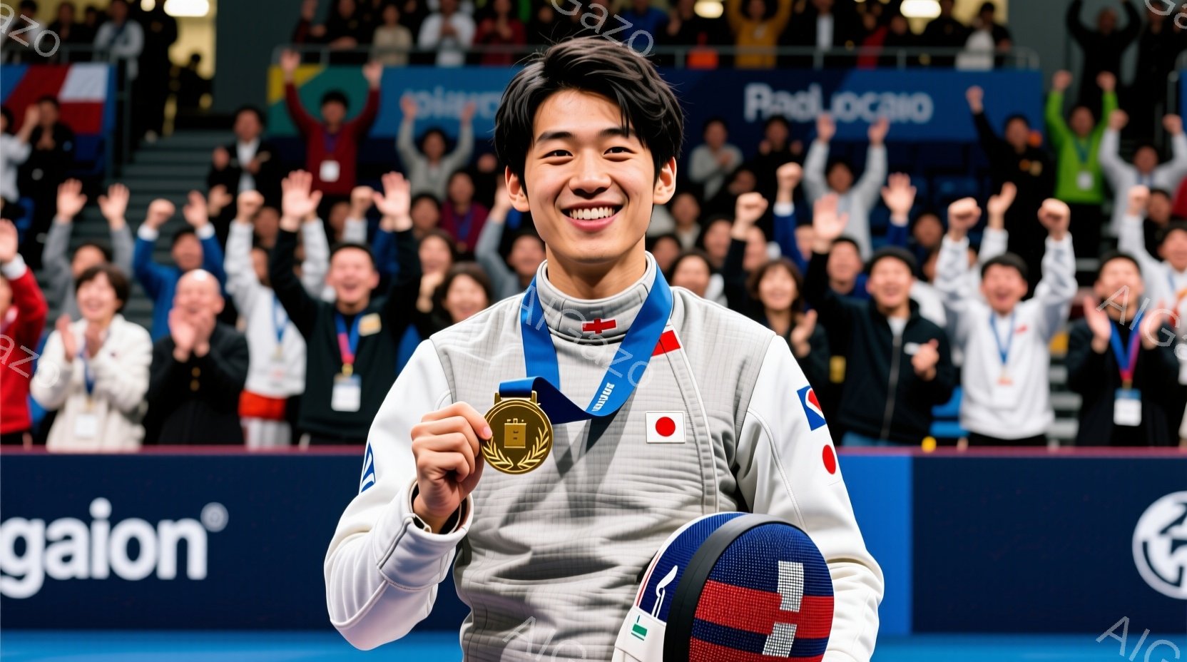 柔道着を着て金メダルを首から下げた若い男性選手が写っています。彼は拳を握り、満面の笑みを浮かべ、勝利の喜びを表現しています。背景には観客席が見え、競技会場の熱気と興奮が伝わってきます。