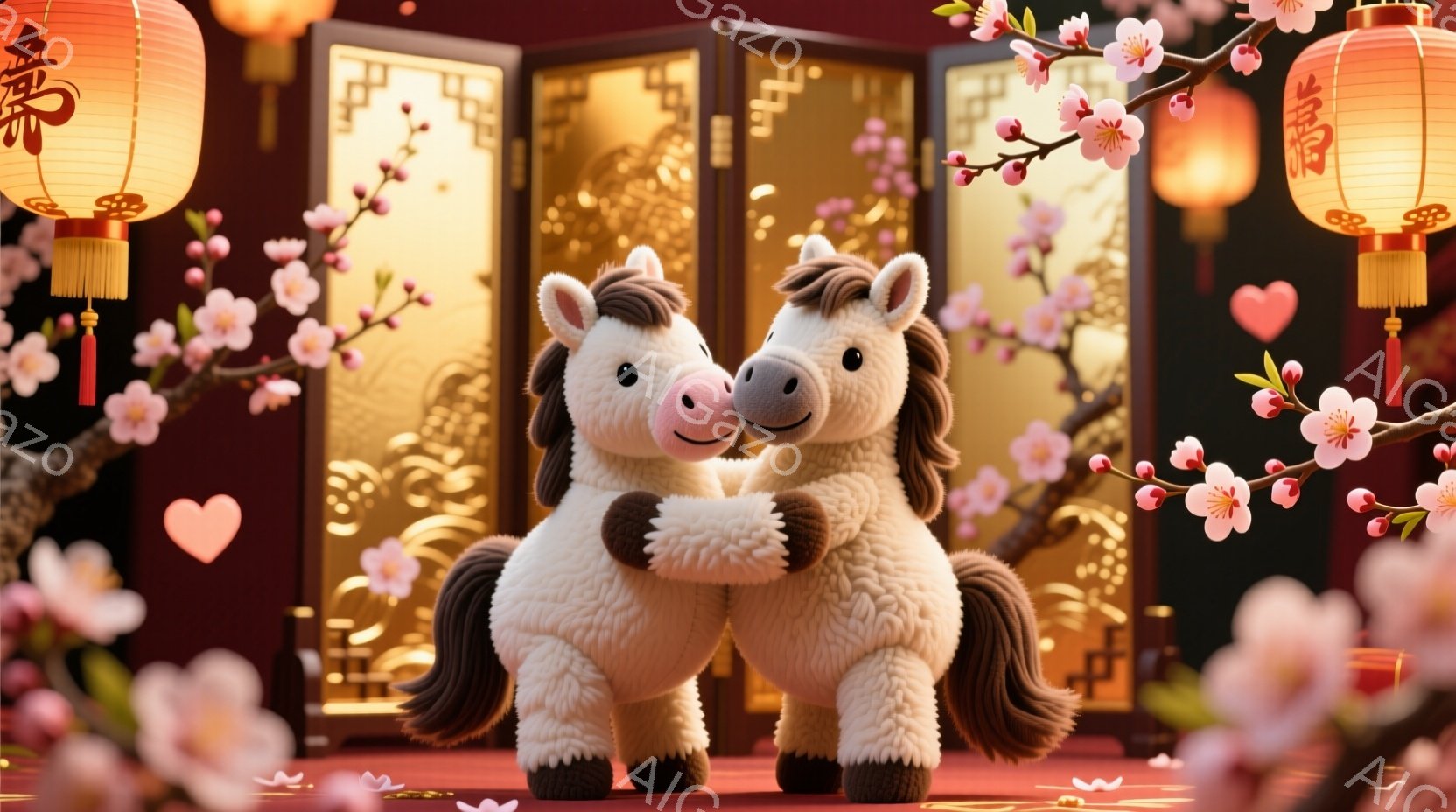 ふわふわの白い馬のカップルが寄り添い、優しい笑顔を浮かべています。背景には、赤い提灯や桜の花が咲き誇り、春節の祝賀ムードを醸し出しています。全体的に暖かく、お祝いの雰囲気に満ちた、幸せなイメージです。