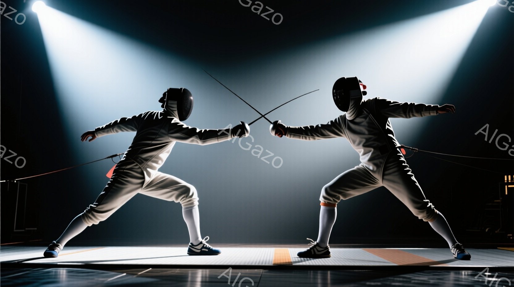 フェンシングの選手が二人、競技場で対峙している。白のフェンシングスーツとマスクを着用し、剣を構え、互いに攻撃の機会をうかがっている。背景は暗く、スポットライトによって選手が照らし出されており、緊張感のある競技の雰囲気が漂っている。