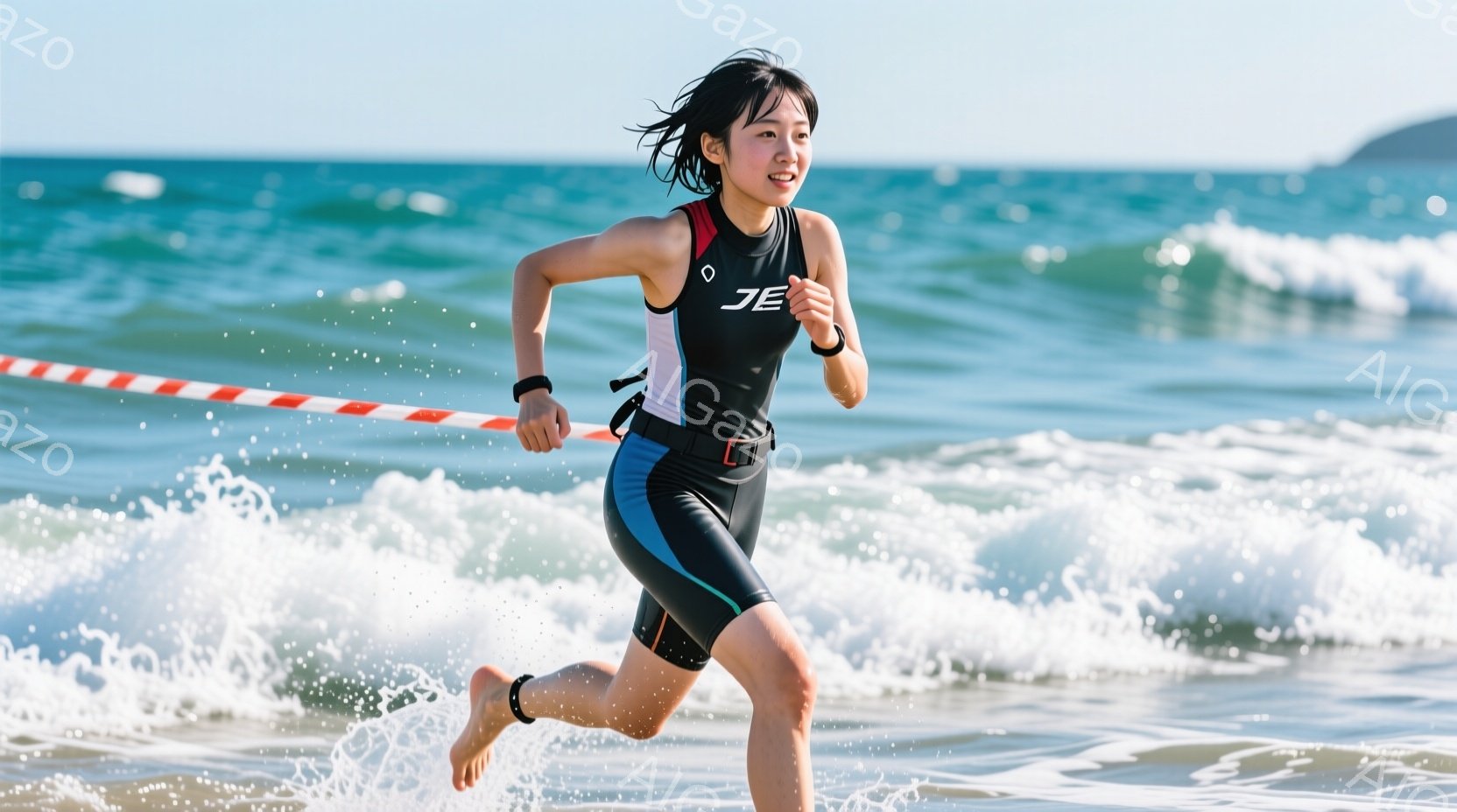 黒いトライスーツを着た女性が、波打ち際を駆け抜けている。彼女は髪をポニーテールにし、笑顔で前を見つめている。背景には青い海と白い波が広がり、晴天の下、活気に満ちた雰囲気が漂う。