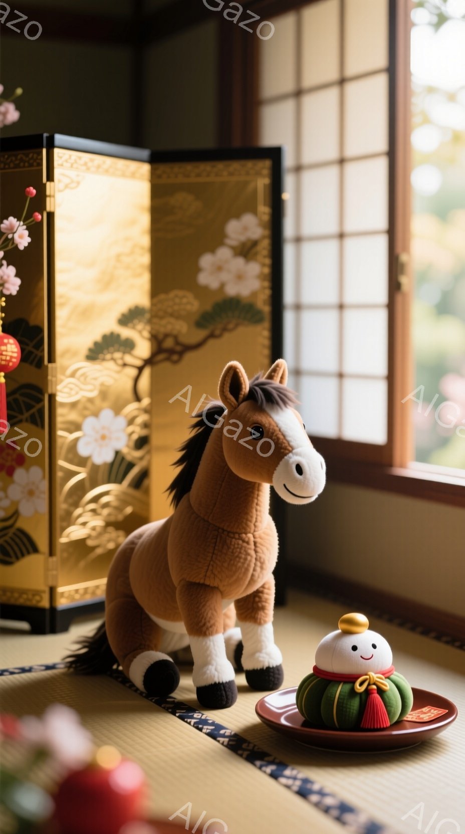 畳の上に、茶色のぬいぐるみ馬が立っており、その前後にそれぞれお団子を載せた小皿が置かれています。背景には金色の牡丹と松の絵が描かれた屏風と、障子戸が見え、落ち着いた和の雰囲気が漂います。全体的に暖色系の色使いで、穏やかで優しい印象を与えます。