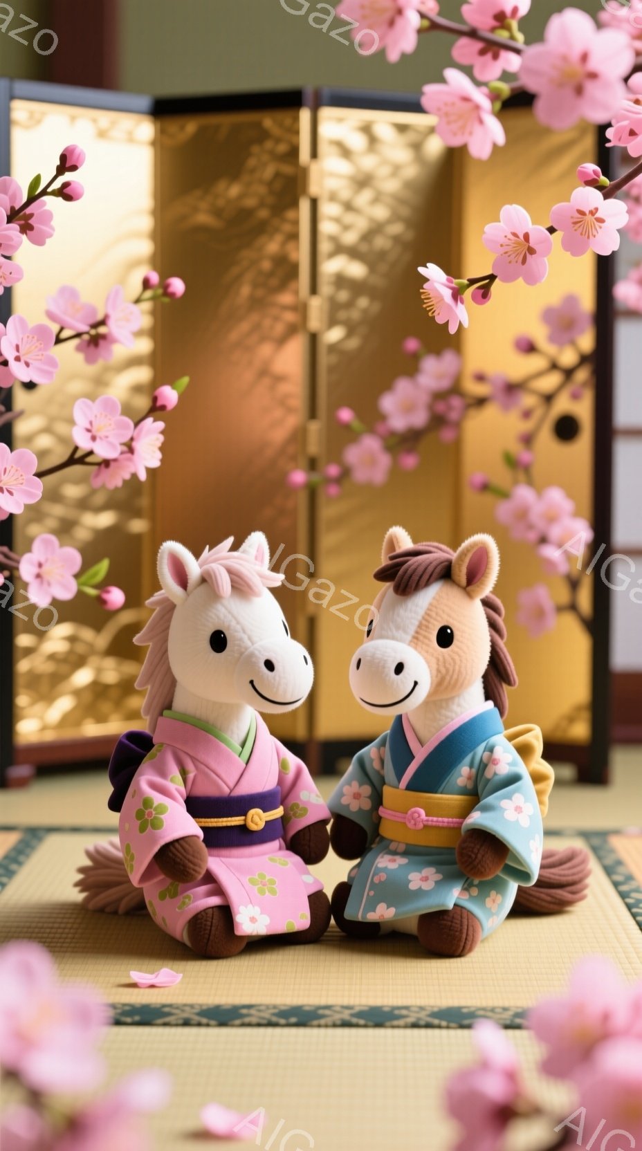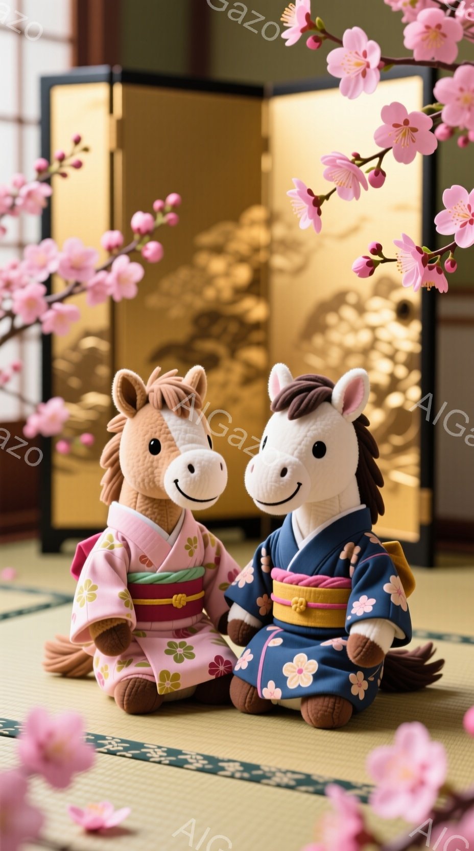 畳の上に、着物を着た2匹のぬいぐるみ馬が並んで座っています。ピンクと濃い青色の着物はそれぞれ白い花柄で、上品な印象を与えます。背景には、桜の花が咲き誇る襖絵があり、春の穏やかな雰囲気を醸し出しています。