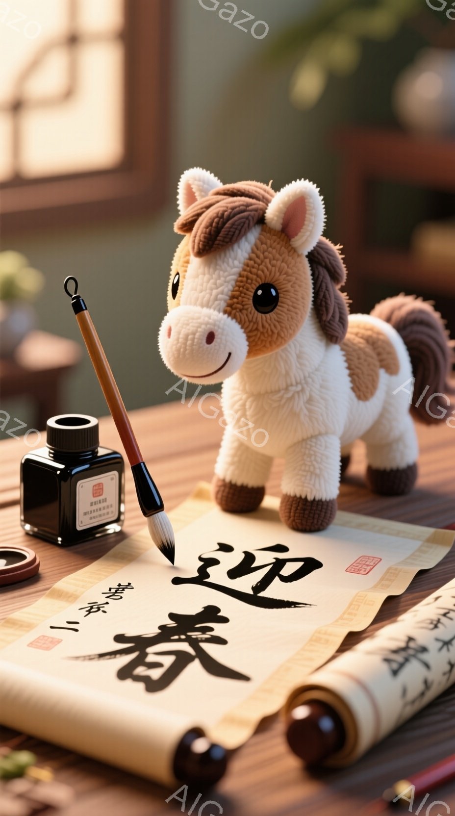 暖かく落ち着いた雰囲気の木製テーブルの上に、可愛らしい白い羊毛の馬の置物が置かれています。馬は穏やかな表情で正面を見つめており、墨と筆、そして書道で書かれた「如意」という文字が描かれた巻物が添えられています。背景にはぼやけた花瓶と窓からの柔らかな光が見え、日本の伝統的な書道の美しさと温かさを表現しています。