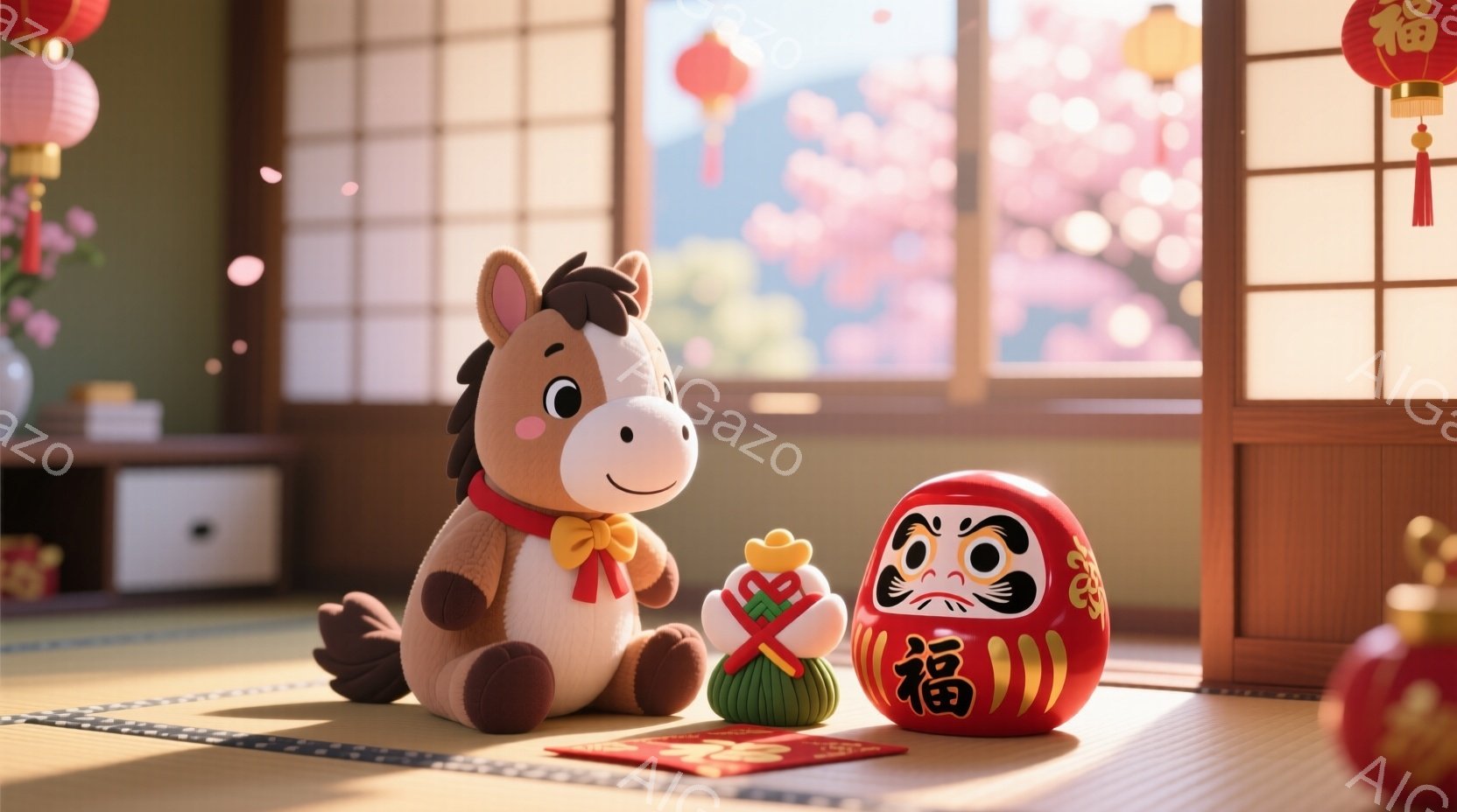 畳の上に、かわいらしいぬいぐるみと縁起の良いものが並んでいます。茶色の馬のぬいぐるみは、赤いだるまのおもちゃと、祝いの結び飾りをつけたお団子と一緒に、春らしい窓辺に座っています。全体的に、暖かく、お祝いの雰囲気で、日本の伝統的な美しさが感じられます。