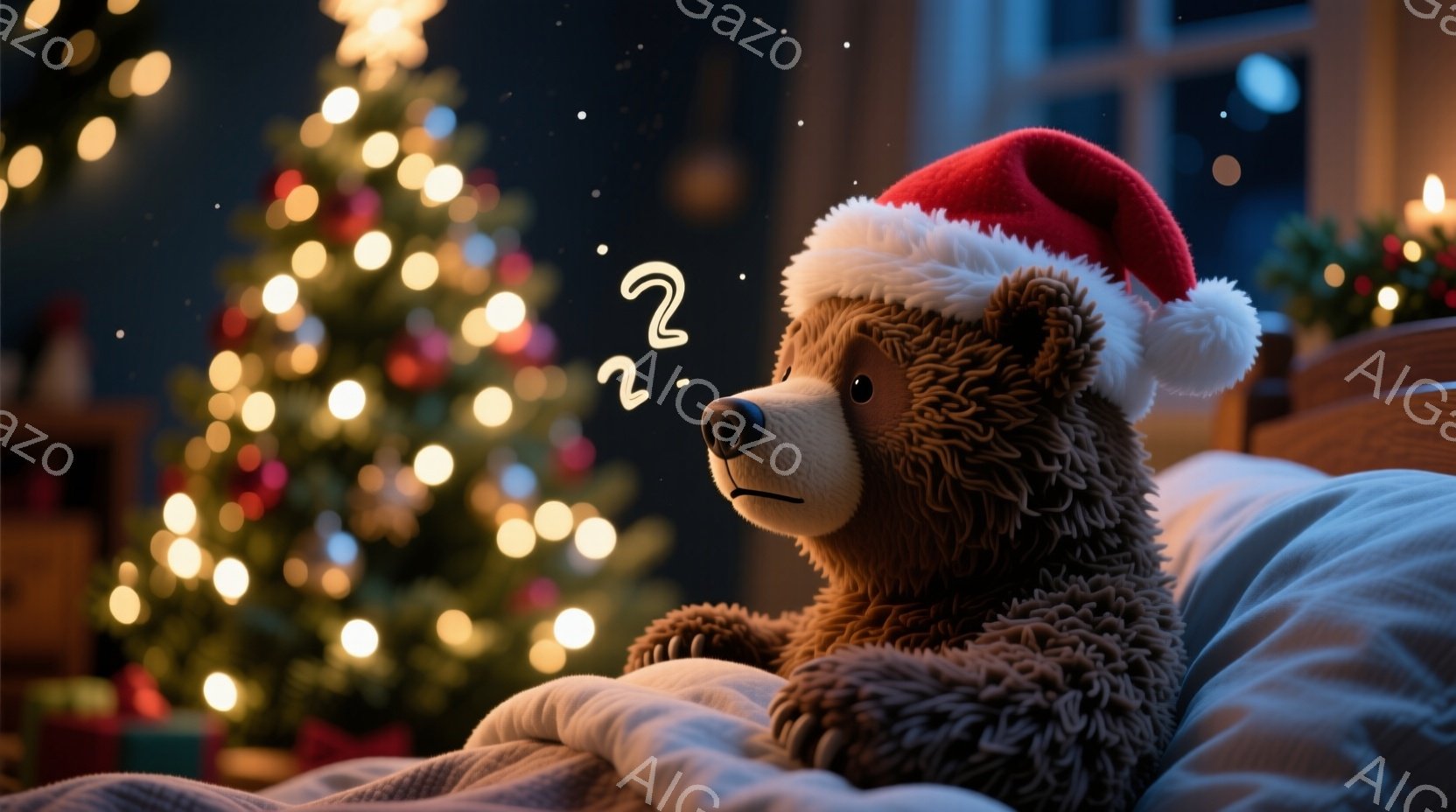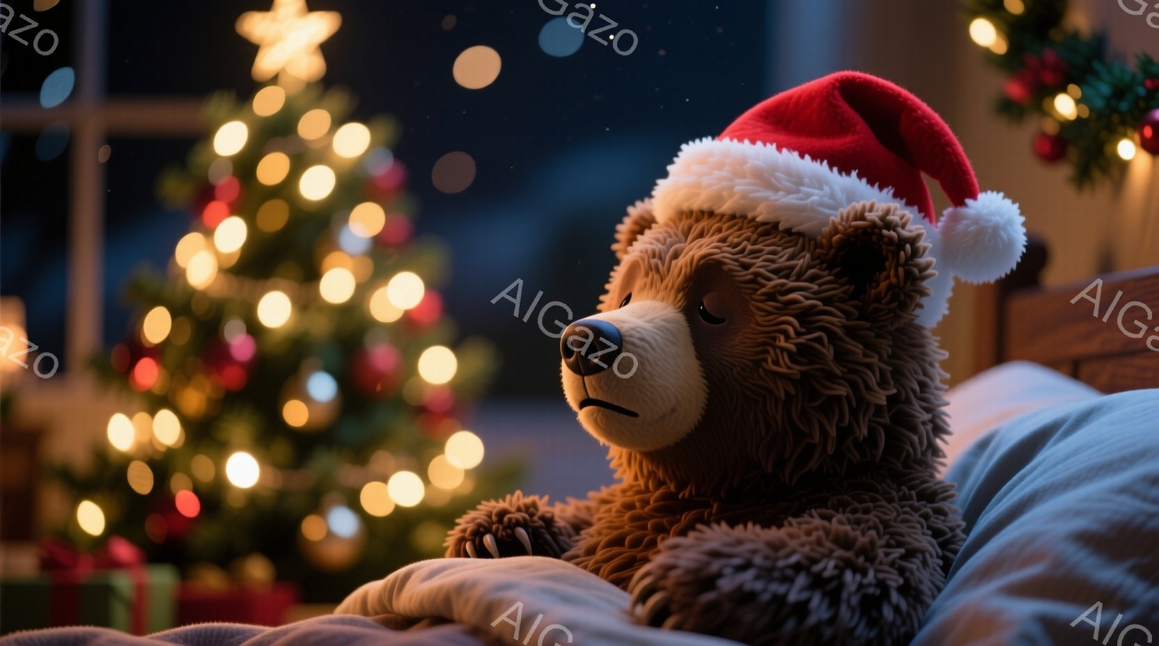 柔らかい茶色のテディベアが、赤いサンタ帽をかぶってベッドに横たわっています。ベアは目を閉じ、穏やかな表情でリラックスした様子です。背景には、キラキラと輝くクリスマスツリーや、ぼんやりとしたプレゼントが見え、暖かく、心地よいクリスマスの夜の雰囲気が漂っています。