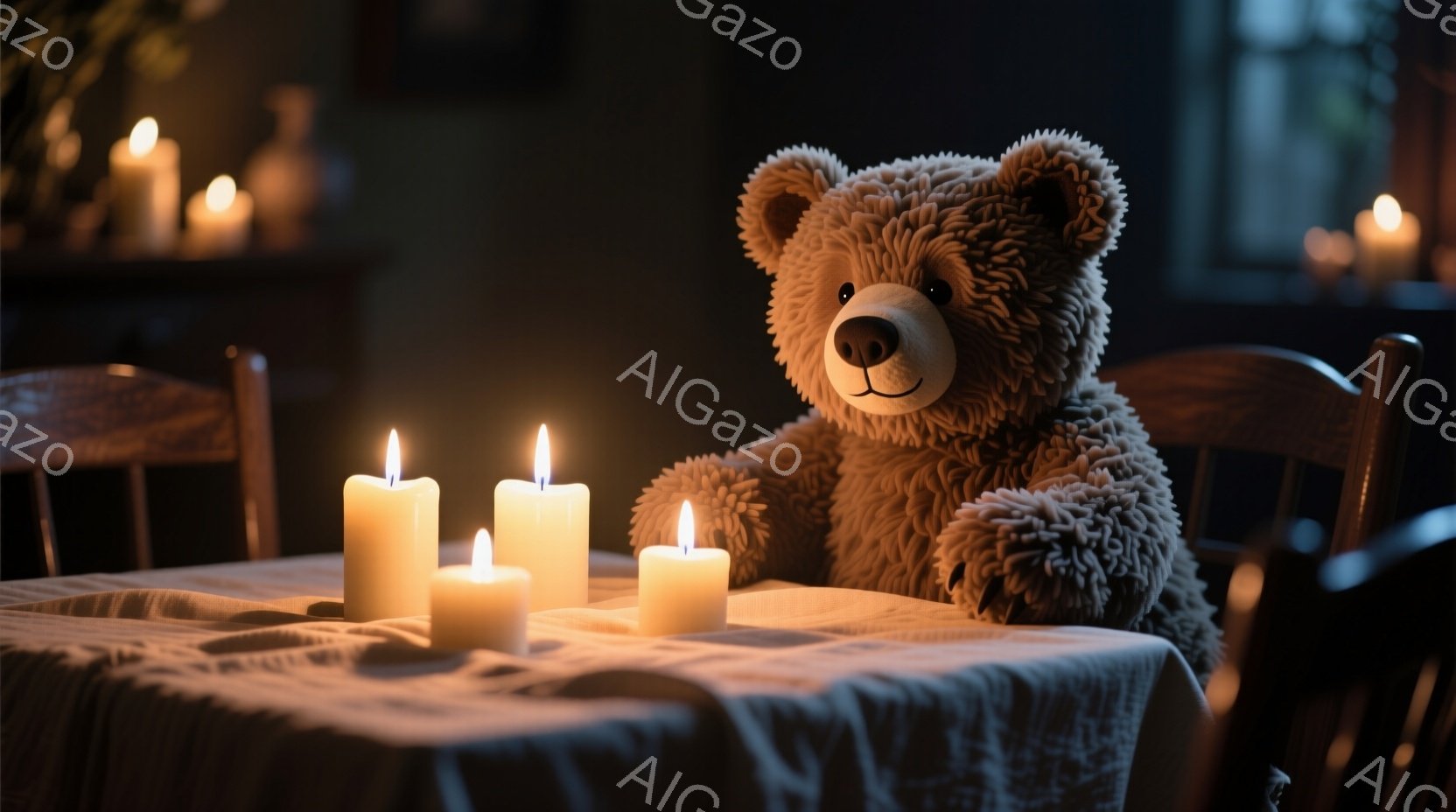 柔らかい毛並みのテディベアが、テーブルに座って白いキャンドルに囲まれています。テーブルは白い布で覆われ、背景にはぼやけた人物と暗い部屋の様子が見えます。全体的に、暖かく、静かで、少しミステリアスな雰囲気が漂っています。