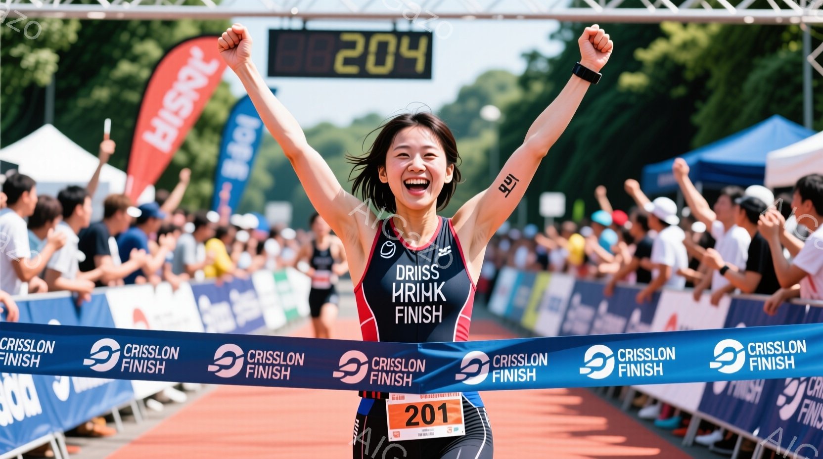 この女性は、マラソンまたはトライアスロンのフィニッシュラインを駆け抜けて喜んでいる様子が写っている。黒いトライアスロンスーツに、ピンクのヘッドバンドを着用し、両手を高く上げて歓喜している。背景には観客や沿道の建物が見え、晴れた日のスポーツイベントの活気ある雰囲気が伝わってくる。