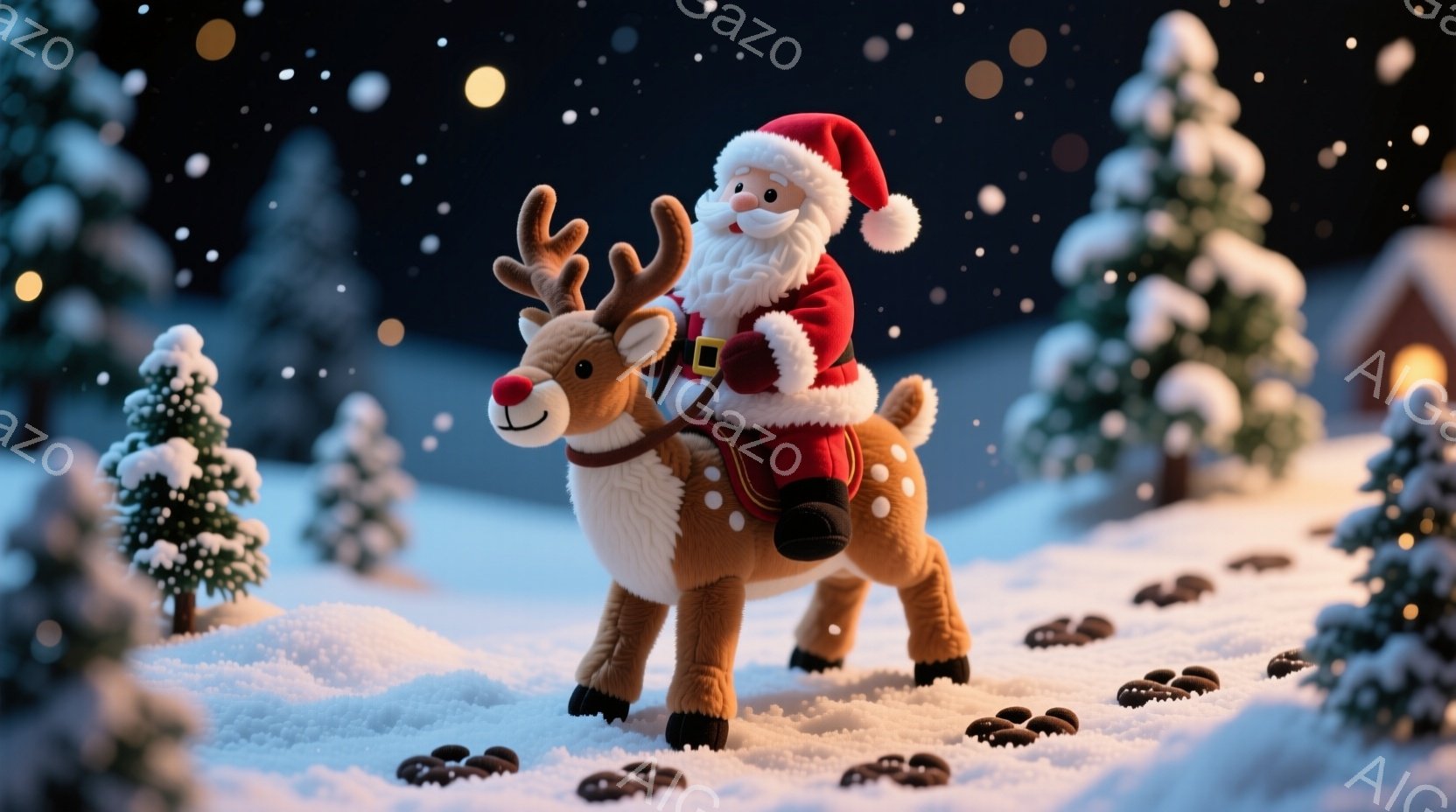 雪が降る夜、トナカイに乗ったサンタクロースが描かれています。サンタクロースは赤い衣装に白い髭、帽子をかぶり、楽しげな表情をしています。背景には雪に覆われた木々が並び、幻想的な冬の夜の雰囲気が漂っています。