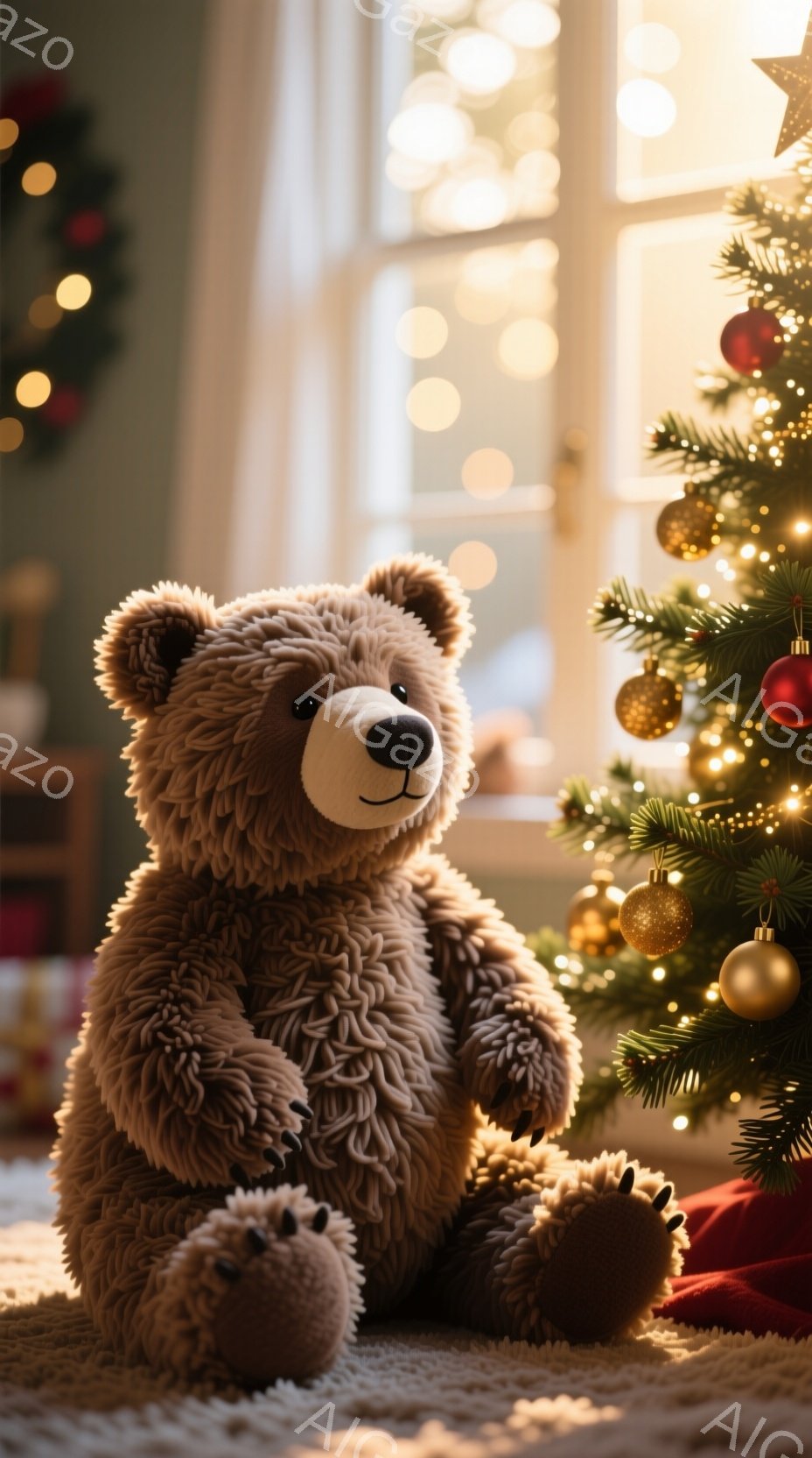 暖炉のそばに座っている茶色のテディベアが写っています。背景には、飾り付けられたクリスマスツリーとぼやけた窓が見え、全体的に温かく、お祝いの雰囲気が漂っています。テディベアは柔らかい毛並みで、まるで温かい抱擁を求めているかのような愛らしい表情をしています。