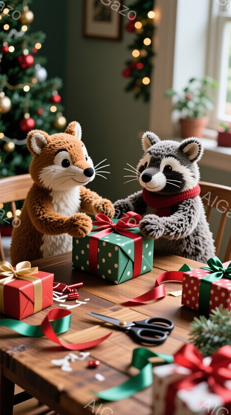 暖炉のある木のテーブルの上に、プレゼントのラッピングをする2匹の動物が描かれています。茶色のクマは赤いスカーフを着用し、黒いイタチは赤いマフラーを巻いており、プレゼントの緑色のリボンを結ぶ作業に集中しています。背景にはクリスマスツリーが飾られ、暖かくお祝いの雰囲気を感じさせます。