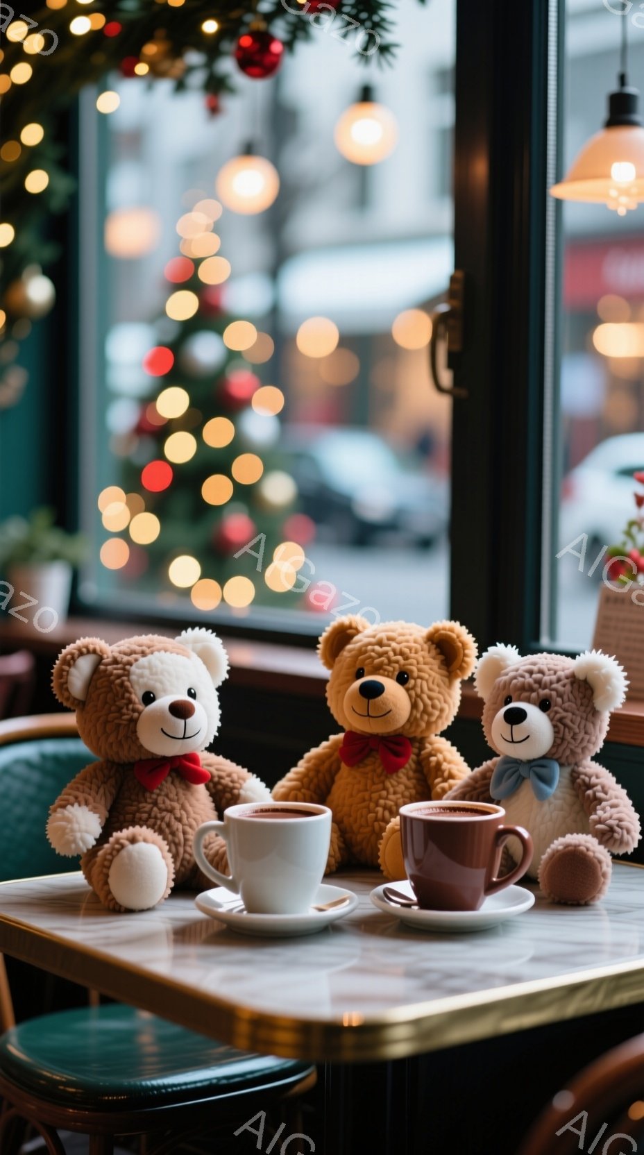 暖炉のそばのテーブルに、緑と赤のリボンを付けた三匹のテディベアが座っています。それぞれのベアは可愛らしい表情で、温かい飲み物と一緒に配置されています。背景にはぼやけたクリスマスツリーと街並みが広がり、冬の暖かく居心地の良い雰囲気を醸し出しています。