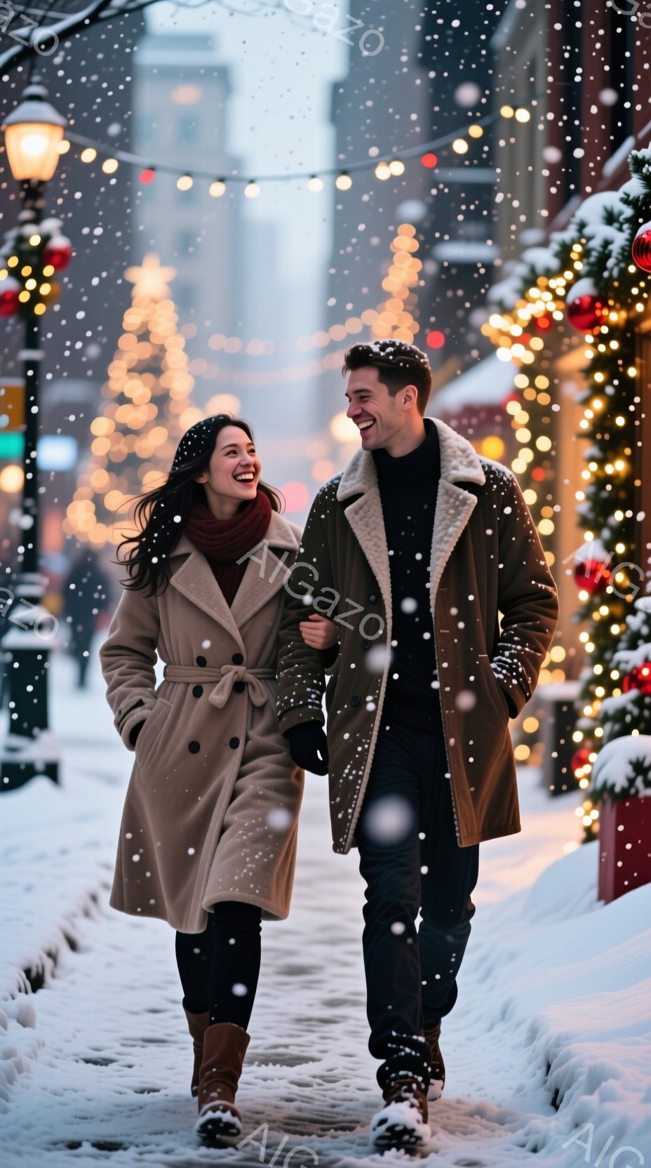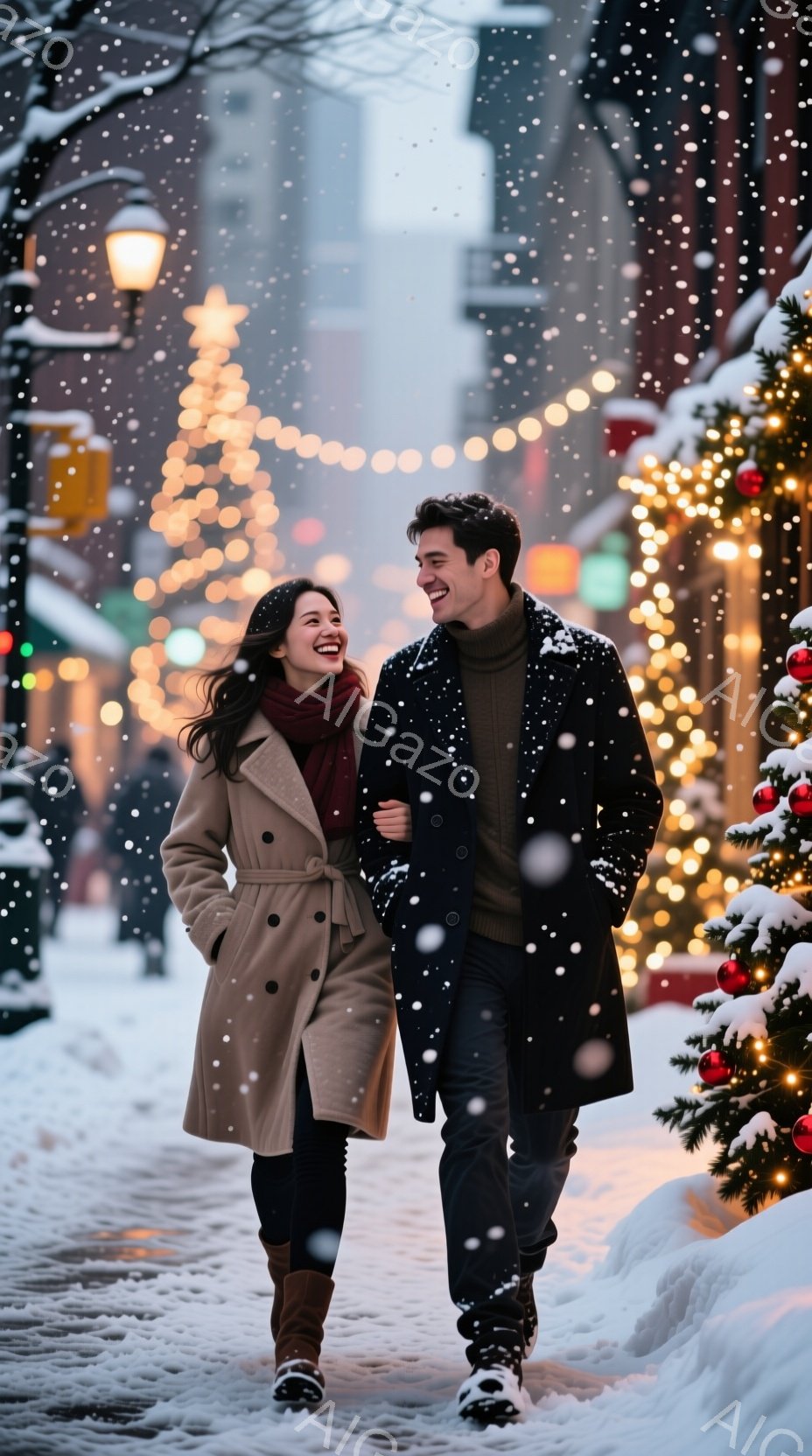 雪が舞う街路を、若い男女が寄り添いながら歩いている。女性はベージュ色のコートに黒いブーツを履き、笑顔を見せている。男性は黒いコートとジーンズ姿で、女性を見て楽しそうに笑っている。背景には、クリスマスツリーやイルミネーションで飾られた建物がぼやけ、ロマンチックで温かい雰囲気を醸し出している。