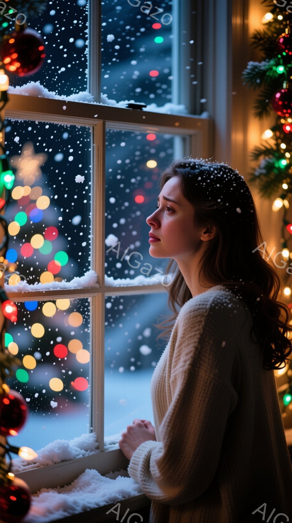 長いダークブラウンの髪を持つ女性が窓辺に立っており、優しい表情で外を見つめています。彼女はオフホワイトの厚手のニットセーターを着ており、リラックスした姿勢で腕を組んでいます。背景には雪が降り積もり、窓の周りにはカラフルなクリスマスライトと装飾が輝き、暖かい冬の雰囲気を醸し出しています。