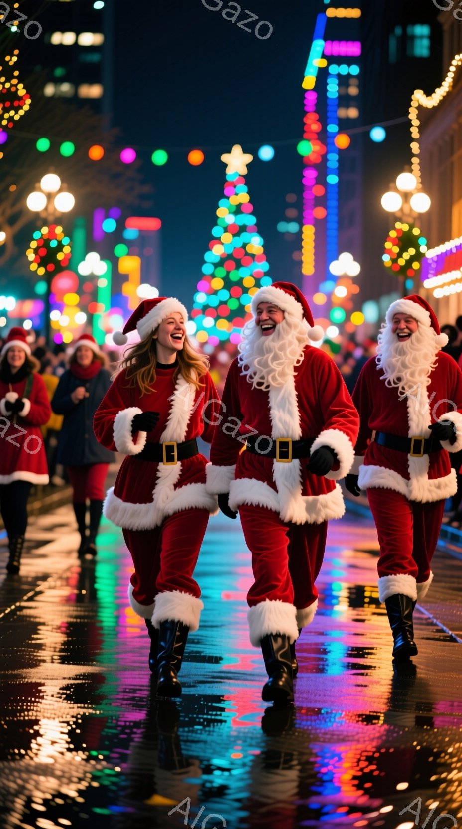 鮮やかなクリスマス装飾が施された街中で、サンタクロースの衣装を着た男性と女性が楽しそうに歩いている。男性は白いひげを生やし、女性は茶色の巻き髪で、両者とも満面の笑みを浮かべている。背景には、クリスマスツリーやイルミネーションが輝き、街全体が暖かく華やかな雰囲気に包まれている。