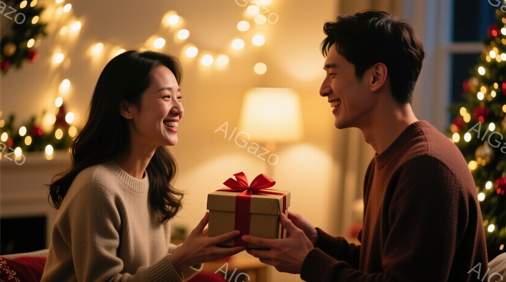 長い髪をなびかせた女性が、赤いリボンで飾られた緑色のプレゼントを男性から受け取ろうとしています。二人は笑顔で互いを見つめ、喜びと温かさが伝わってきます。背景にはクリスマスツリーや飾り付けがぼんやりと見え、華やかなクリスマスの雰囲気が漂っています。