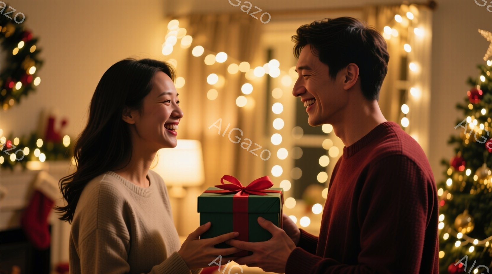 女性は柔らかいセーターを着ており、長い髪は肩にかかっています。彼女は笑顔でプレゼントを受け取ろうとしており、男性は赤いリボンで飾られた箱を差し出しています。背景にはぼやけたクリスマスツリーと、温かい光のイルミネーションがあり、温かく幸せな雰囲気が漂っています。