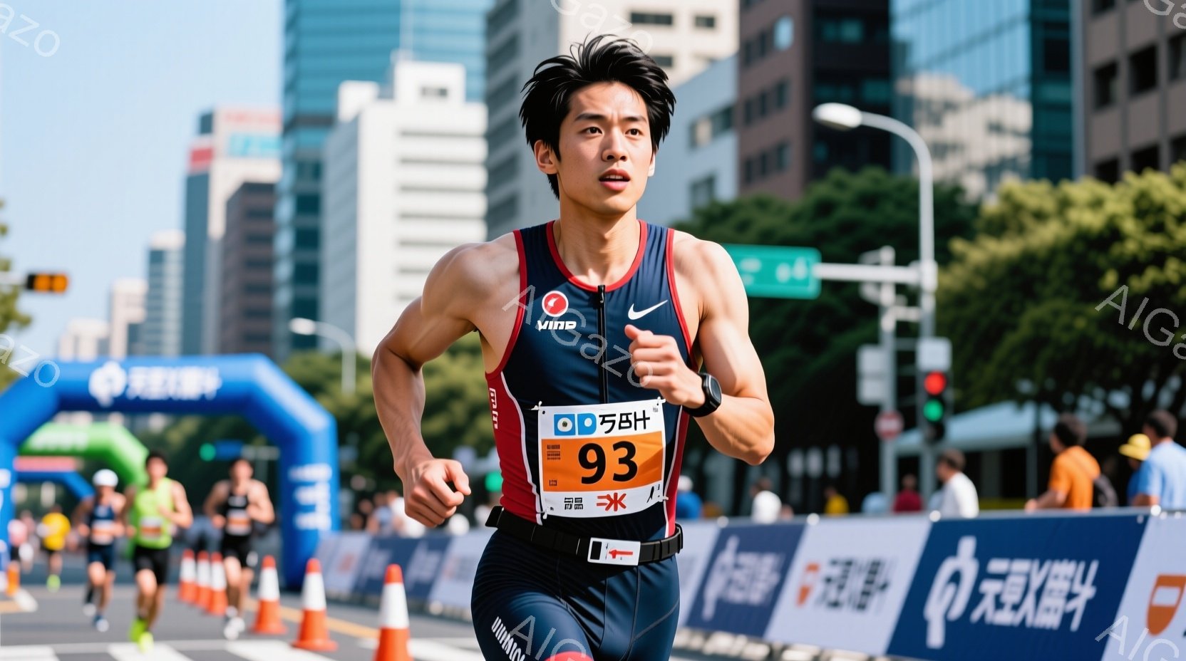 競技中の男性ランナーが写っている。黒のトライスーツに赤いラインが入っており、胸にはスポンサーロゴが大きくプリントされている。背景には高層ビルが立ち並び、多くの観客や他のランナーがいて、活気に満ちた競技の様子が伝わってくる。